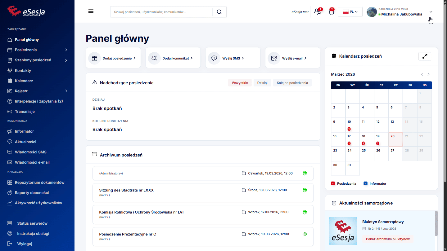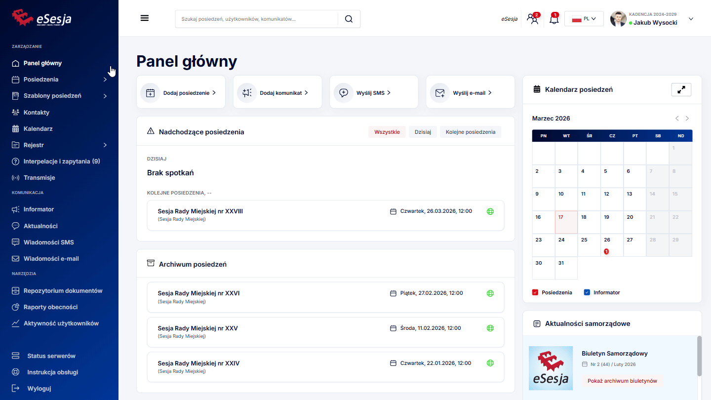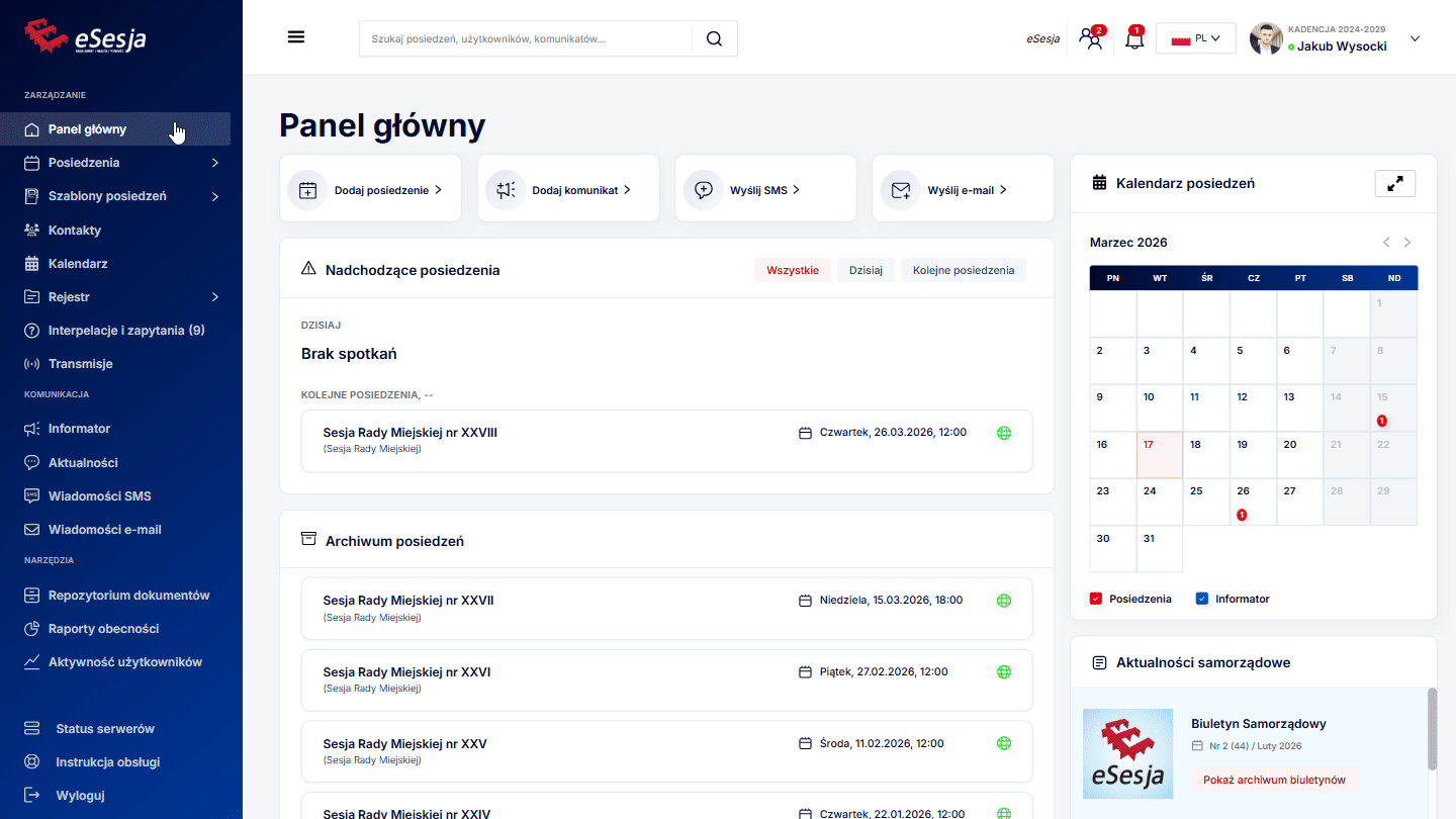 - Sekcja przeglądu posiedzeń – w tym miejscu widoczne są nadchodzące posiedzenia z podziałem na dzisiejsze oraz przyszłe, a także archiwum z widocznymi ostatnimi posiedzeniami.