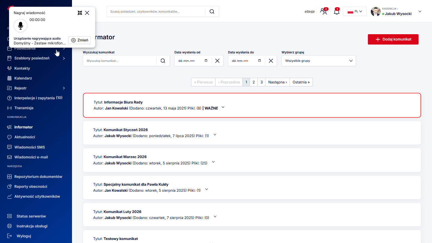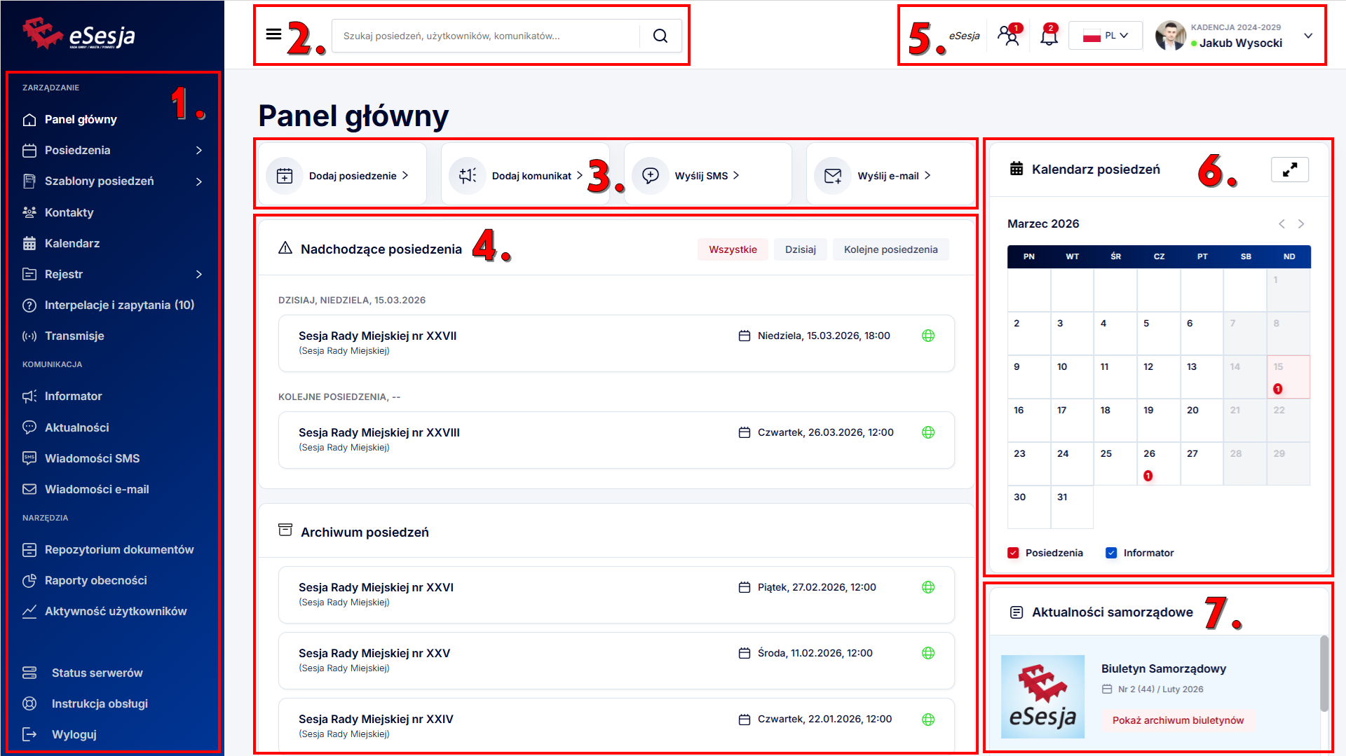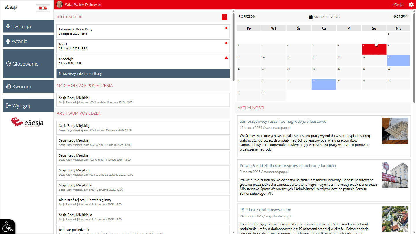 - Sekcja przeglądu posiedzeń – w tym miejscu widoczne są nadchodzące posiedzenia z podziałem na dzisiejsze oraz przyszłe, a także archiwum z widocznymi ostatnimi posiedzeniami.
