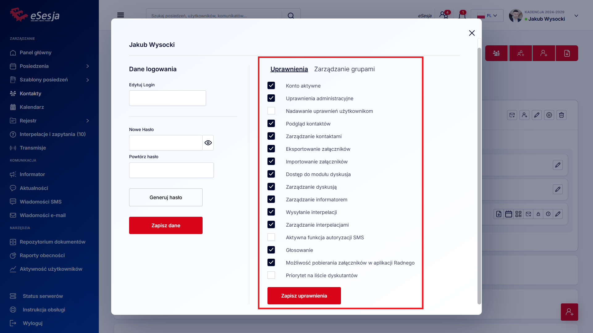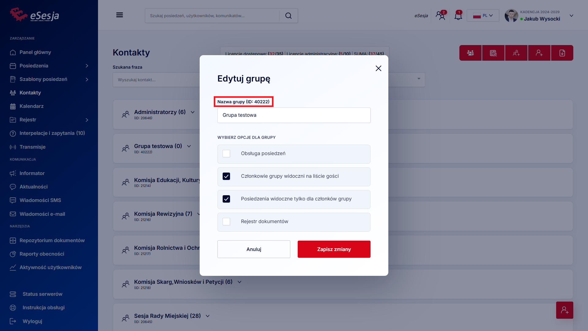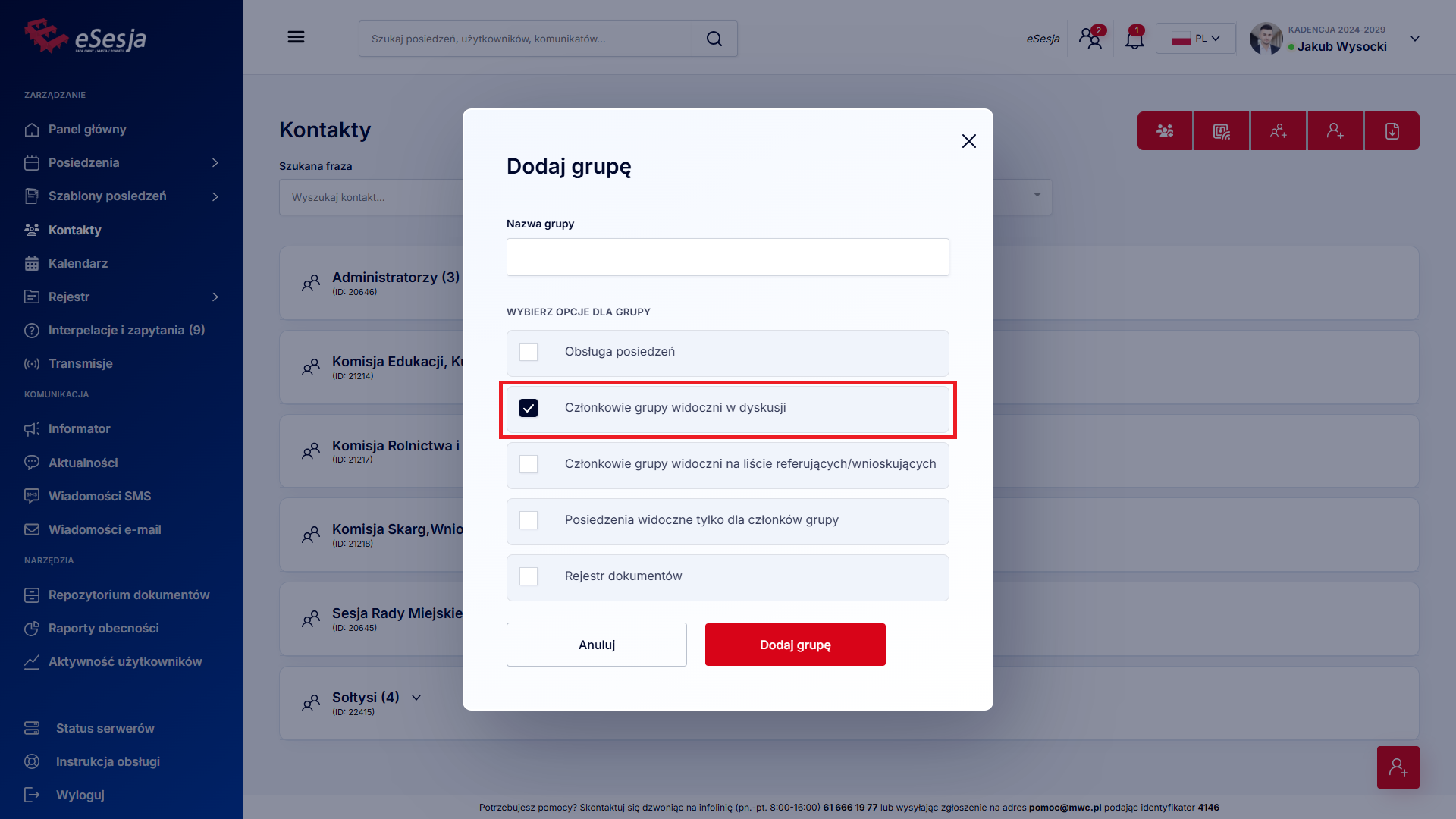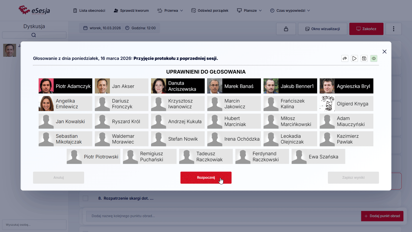 Uprawnieni do głosowania – wybór, dla której grupy spośród grup przypisanych do posiedzenia jest przeznaczone głosowanie. Tylko zaznaczona grupa będzie miała możliwość oddania głosu.