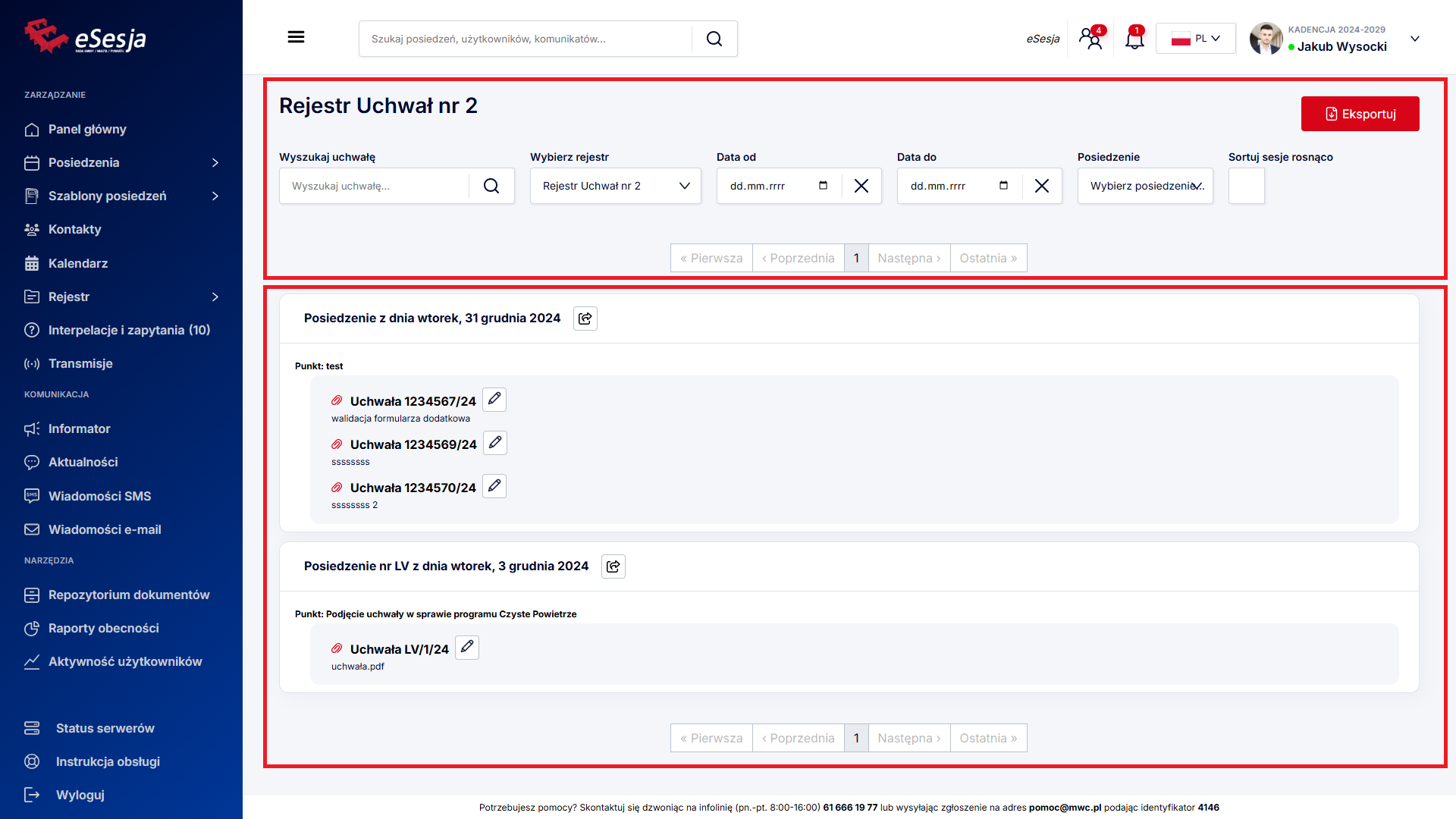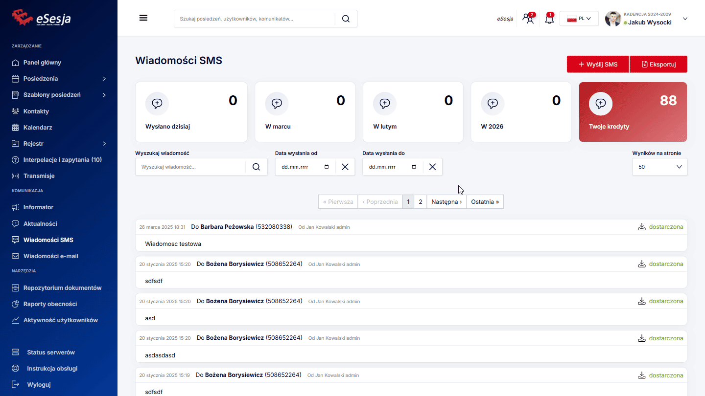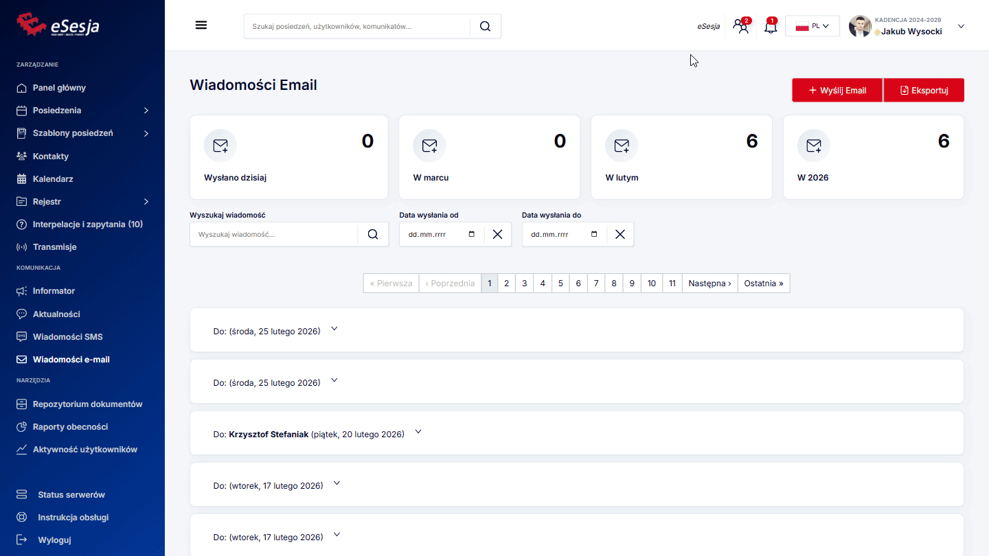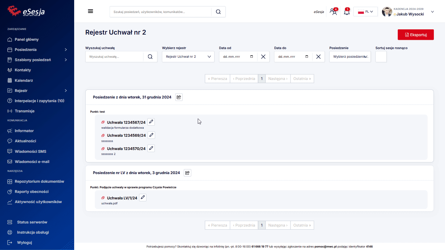 Po wybraniu z menu zakładki Posiedzenia wyświetla się lista dodanych posiedzeń. W celu wyszukania konkretnego posiedzenia możemy posłużyć się dostępnymi filtrami: