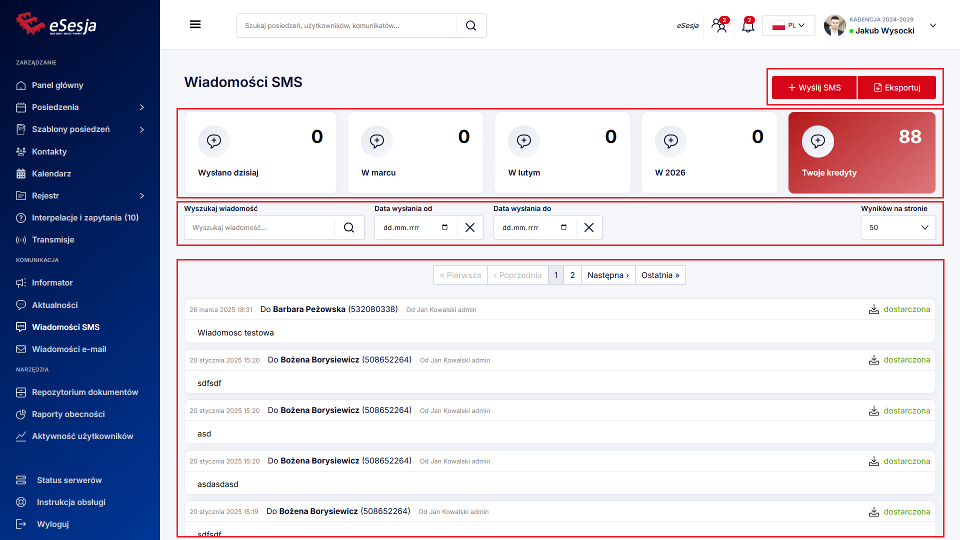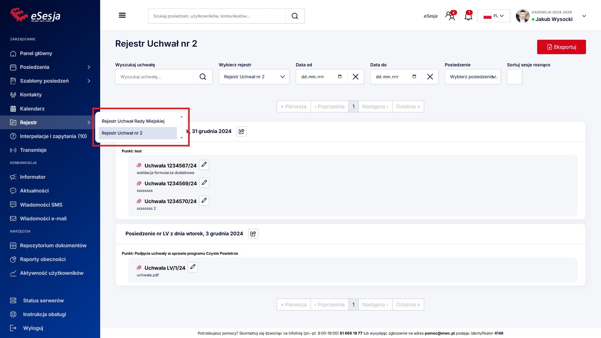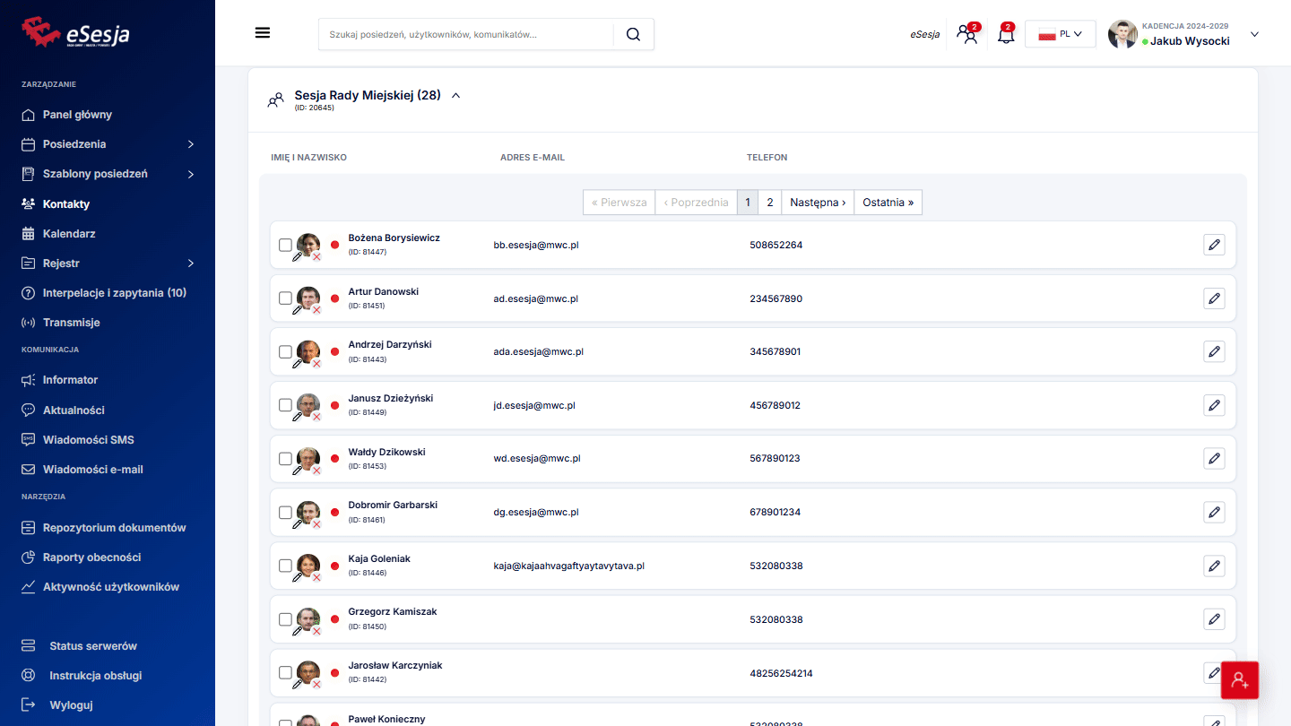 Po wybraniu z menu zakładki Posiedzenia wyświetla się lista dodanych posiedzeń. W celu wyszukania konkretnego posiedzenia możemy posłużyć się dostępnymi filtrami: