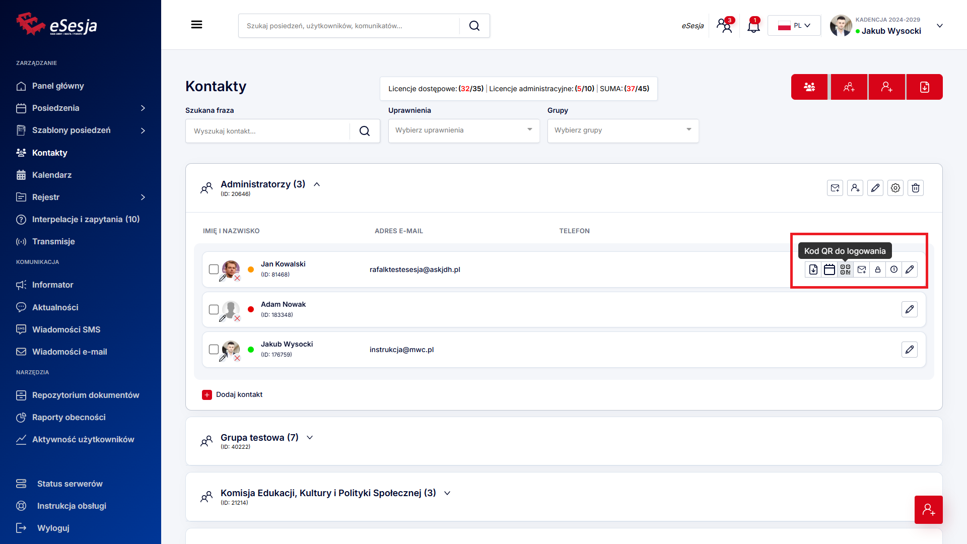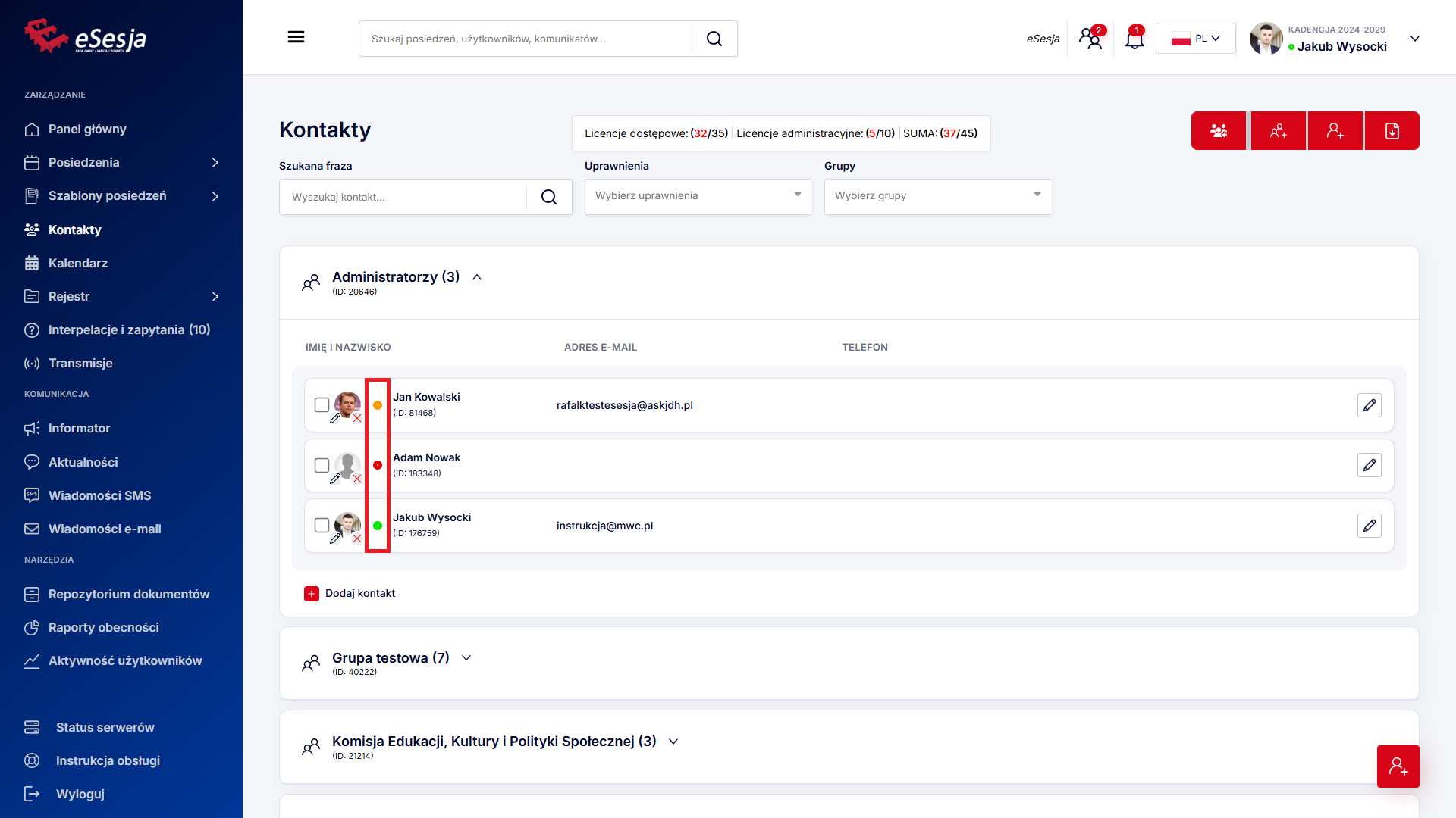 - Użytkownicy online na podstawie zalogowanych mikrofonów – włączona powoduje, że status użytkowników widocznych w systemie będzie pobierany bezpośrednio z zalogowanego mikrofonu. Obowiązuje tylko w przypadku posiadania integracji z systemem eSesja.