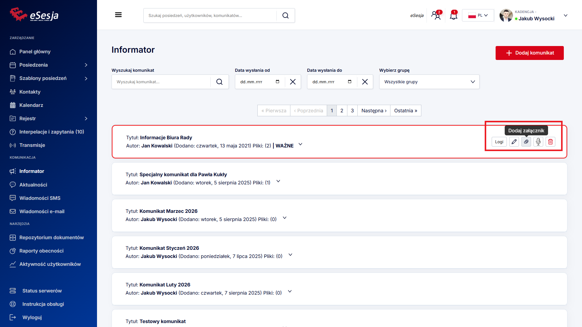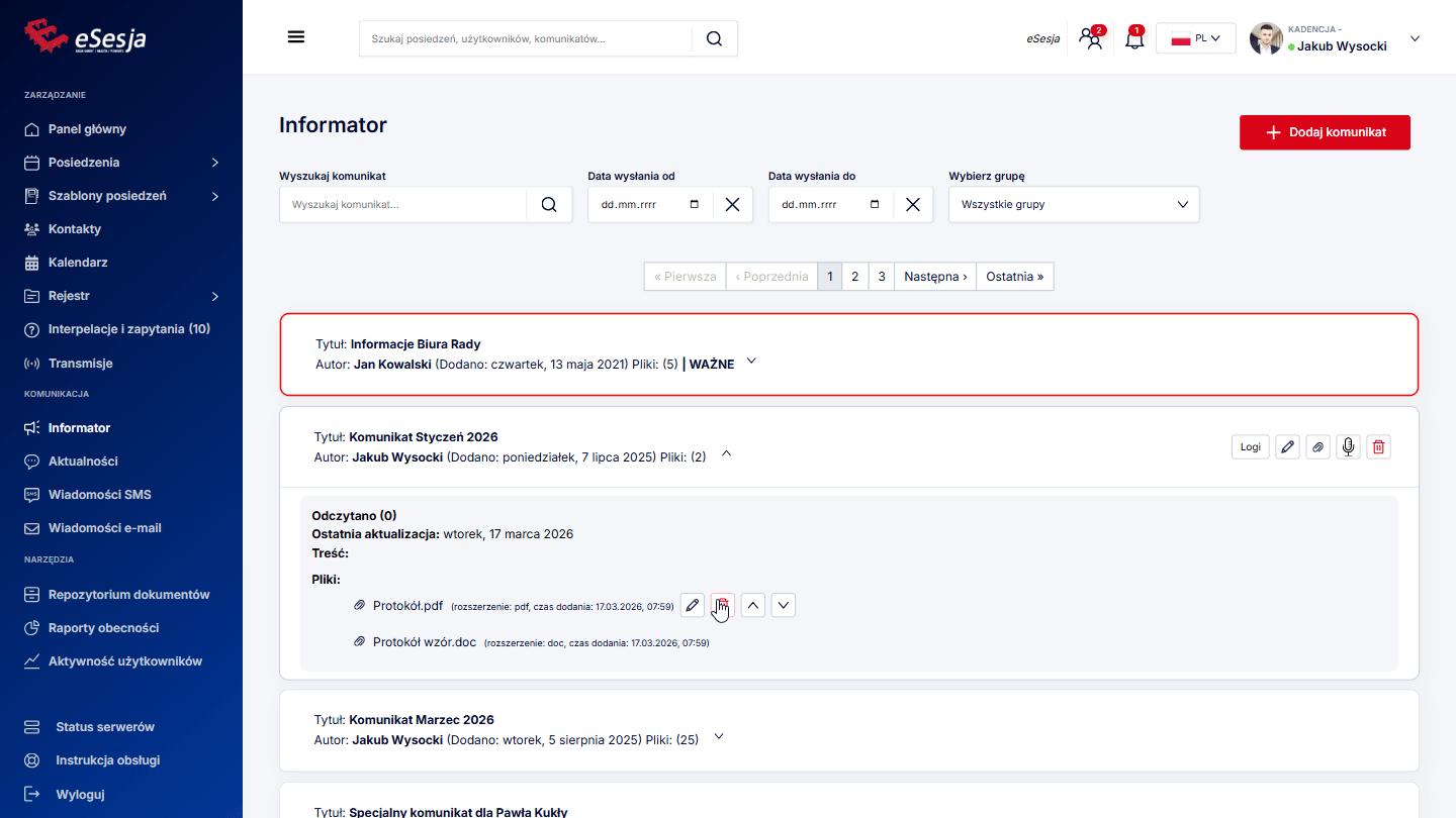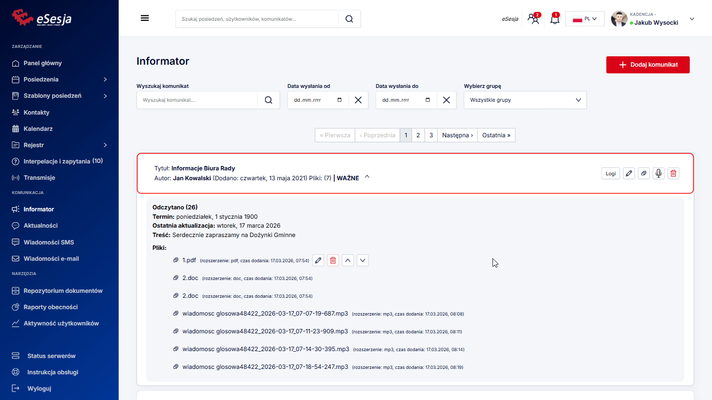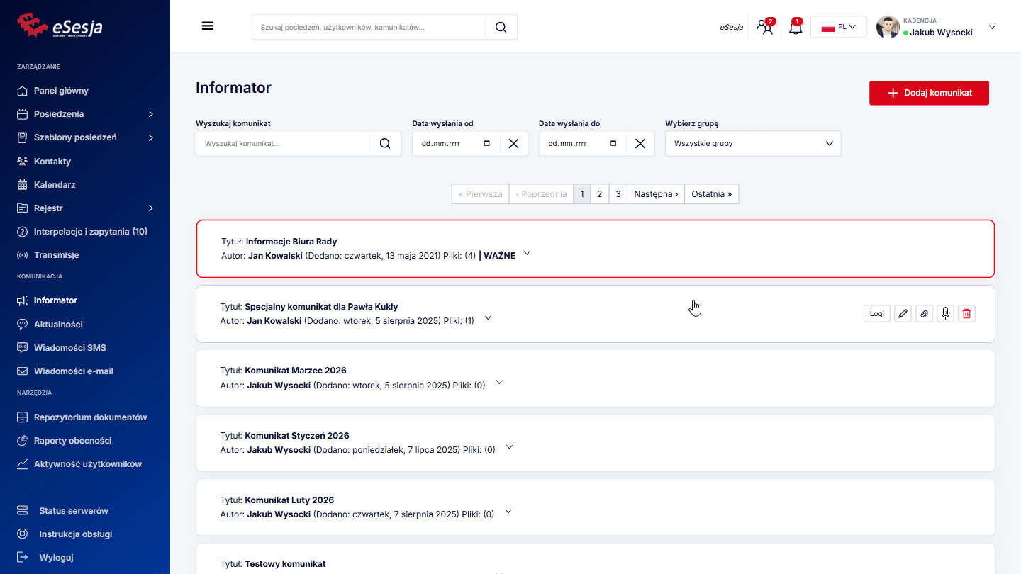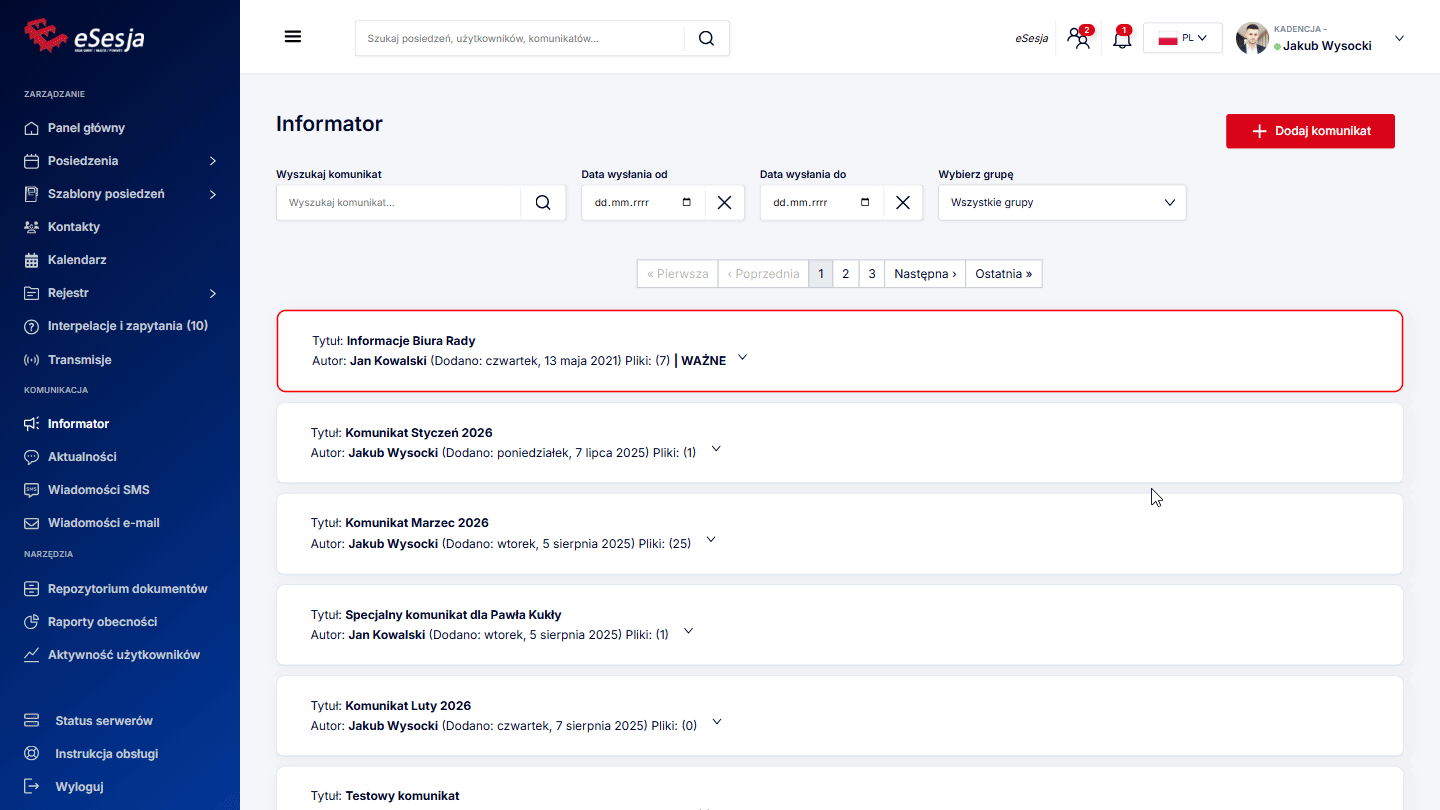 - Kalendarz posiedzeń – w kalendarzu oznaczone są wszelkie dodane posiedzenia oraz komunikaty.