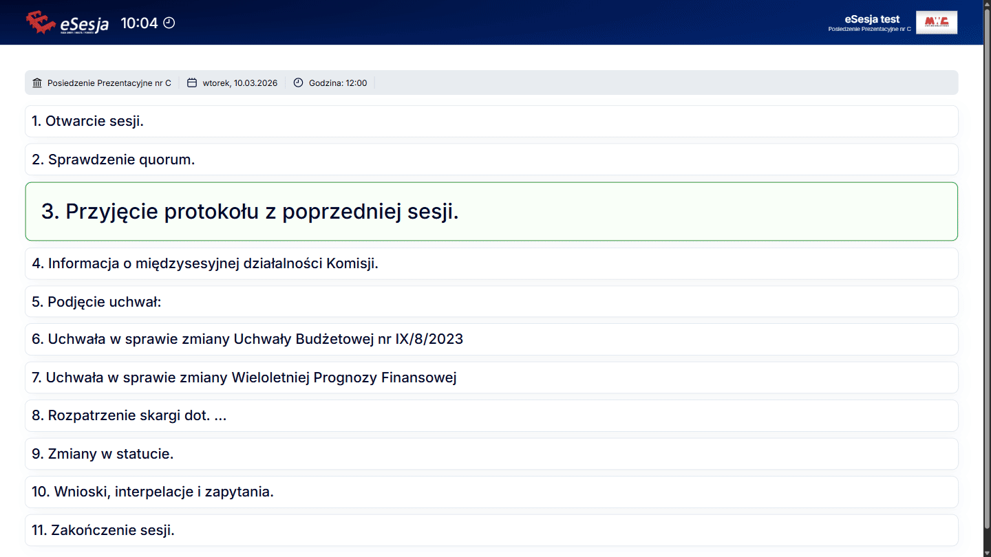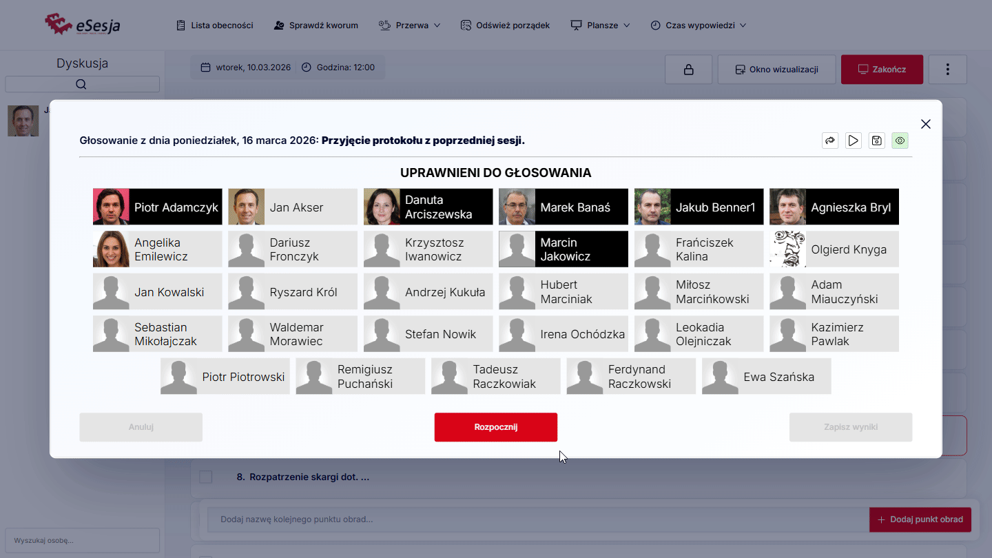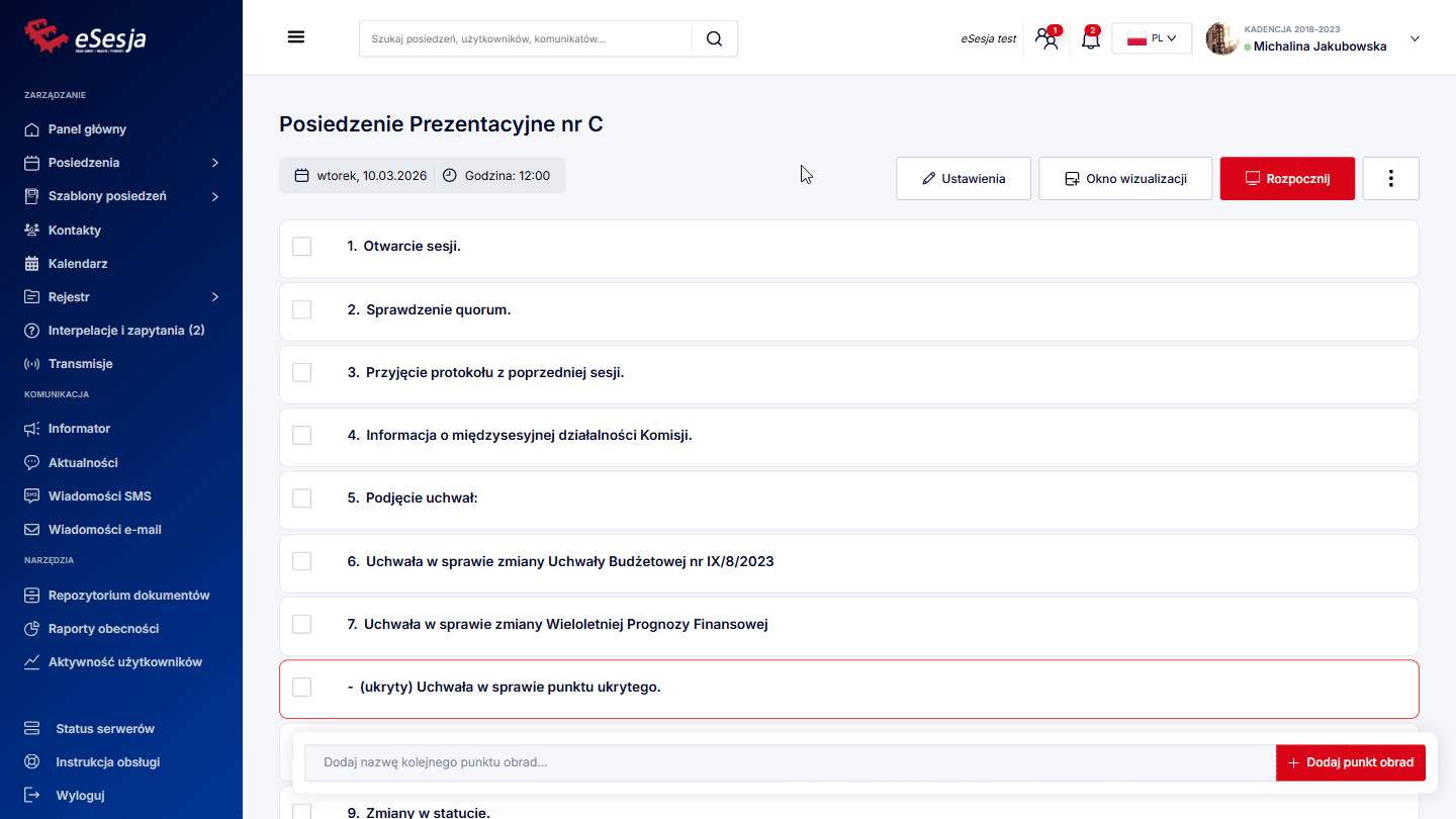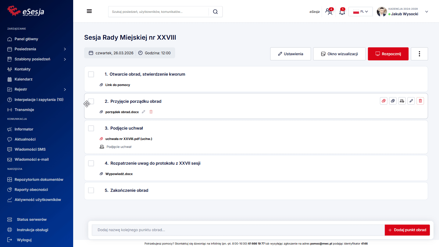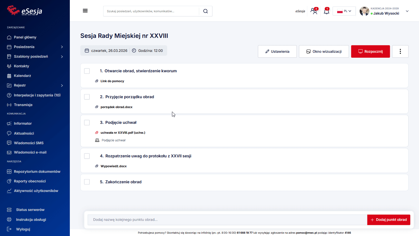 Aby funkcja działała poprawnie w trakcie posiedzenia, należy pamiętać o tym, aby za każdym razem, aktywować punkt porządku obrad, poprzez kliknięcie Aktywuj punkt, gdy już rozpoczniemy posiedzenie.