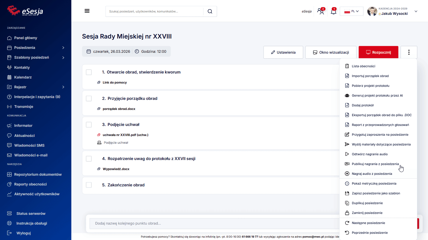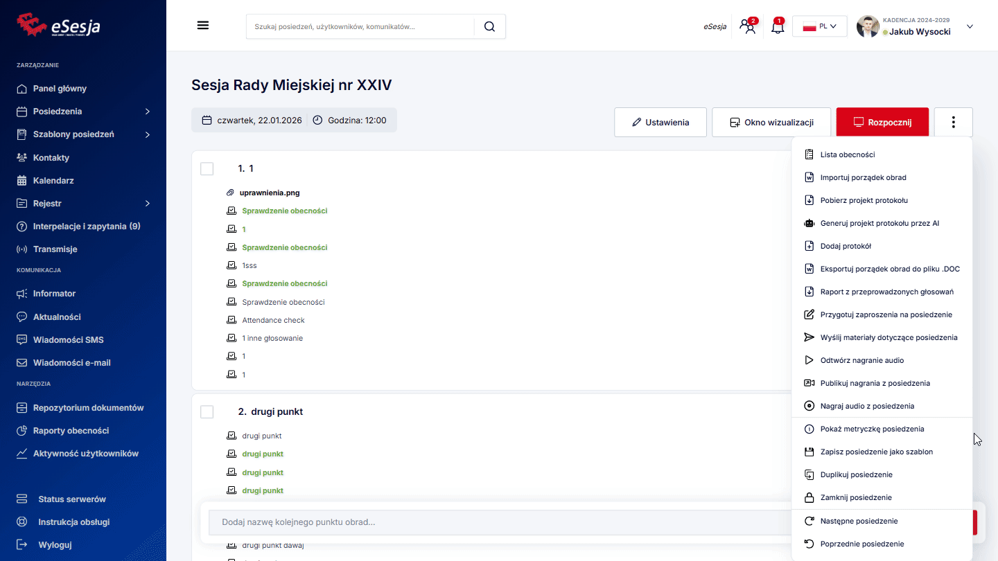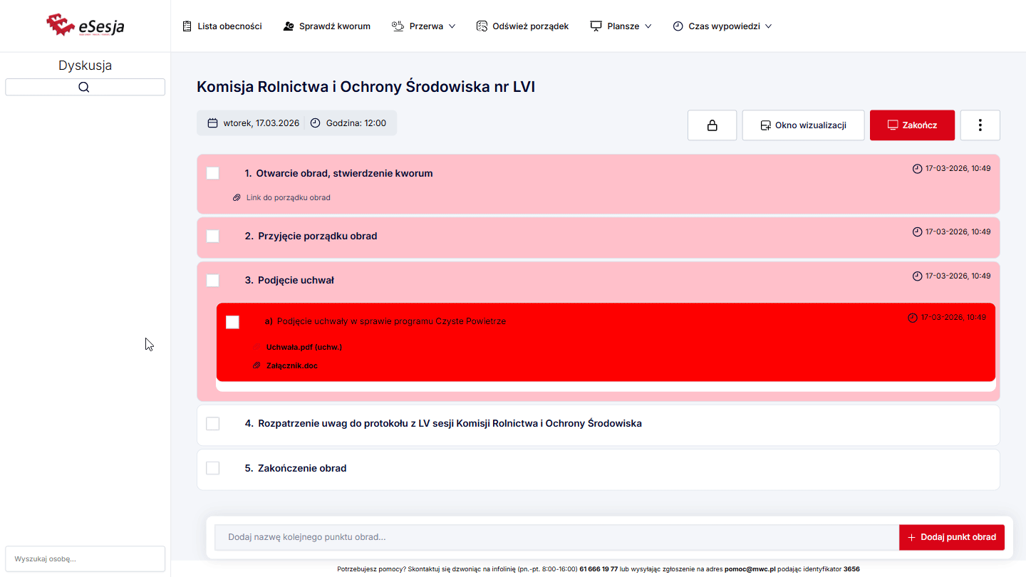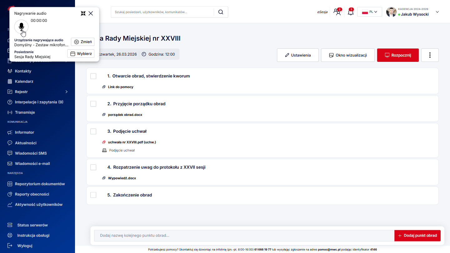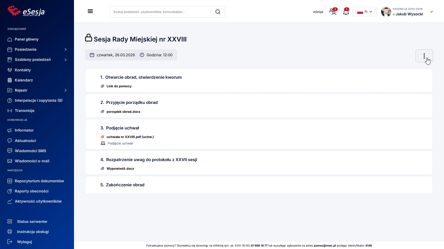 Aby funkcja działała poprawnie w trakcie posiedzenia, należy pamiętać o tym, aby za każdym razem, aktywować punkt porządku obrad, poprzez kliknięcie Aktywuj punkt, gdy już rozpoczniemy posiedzenie.