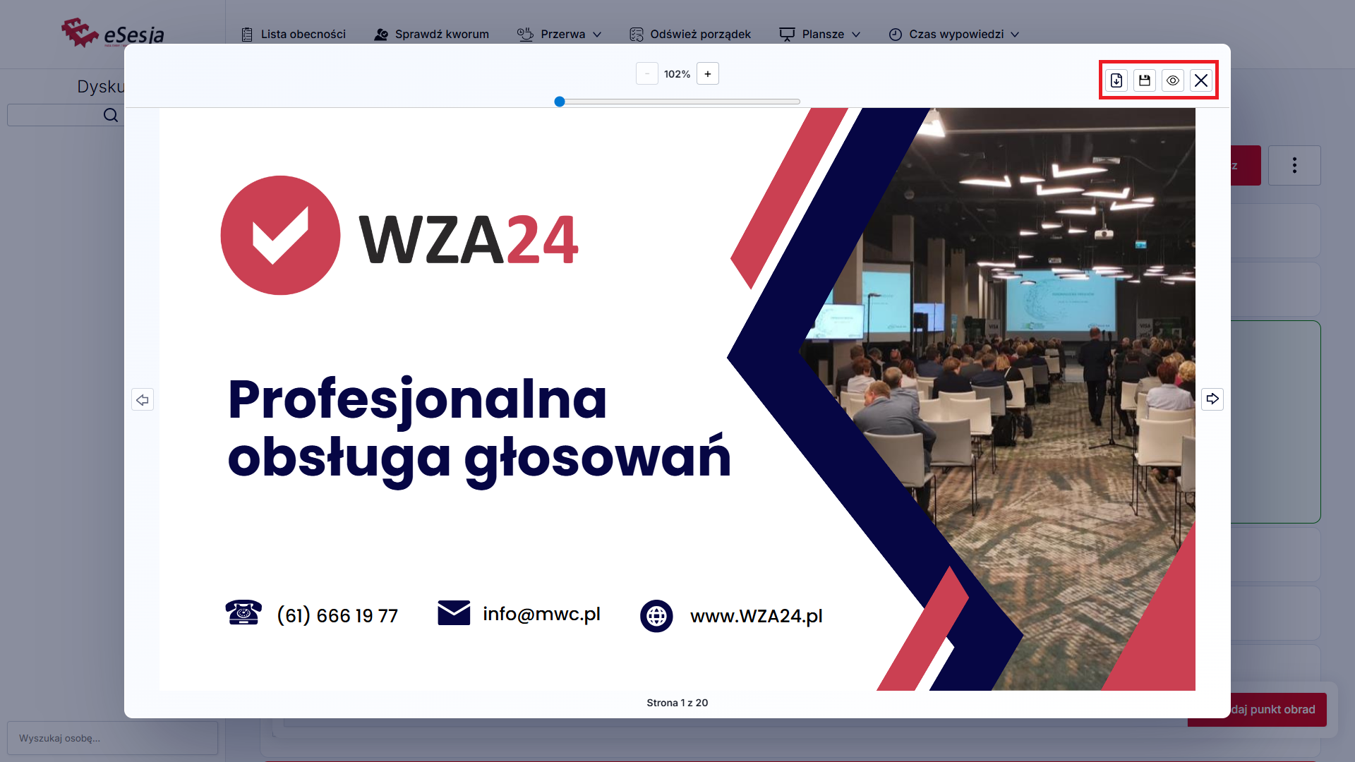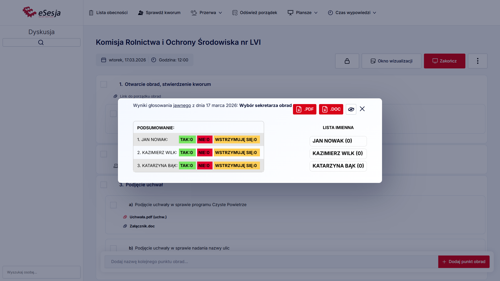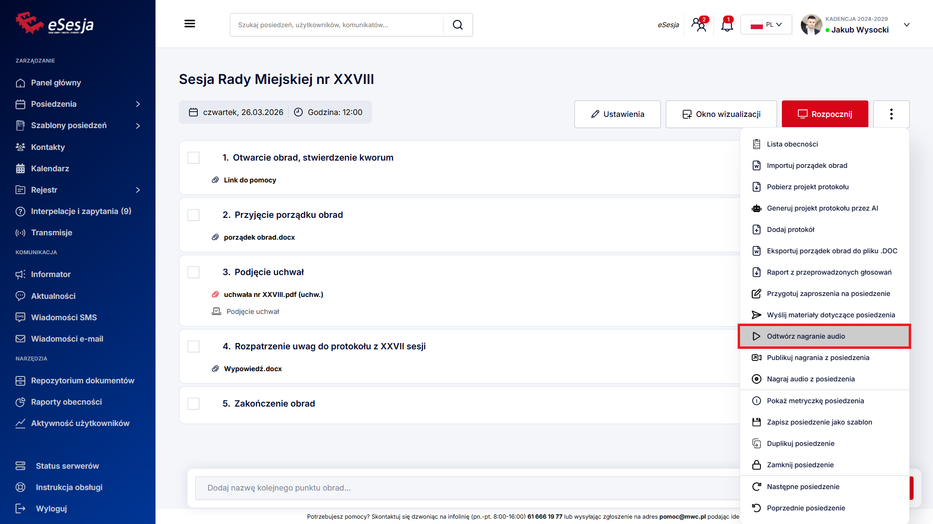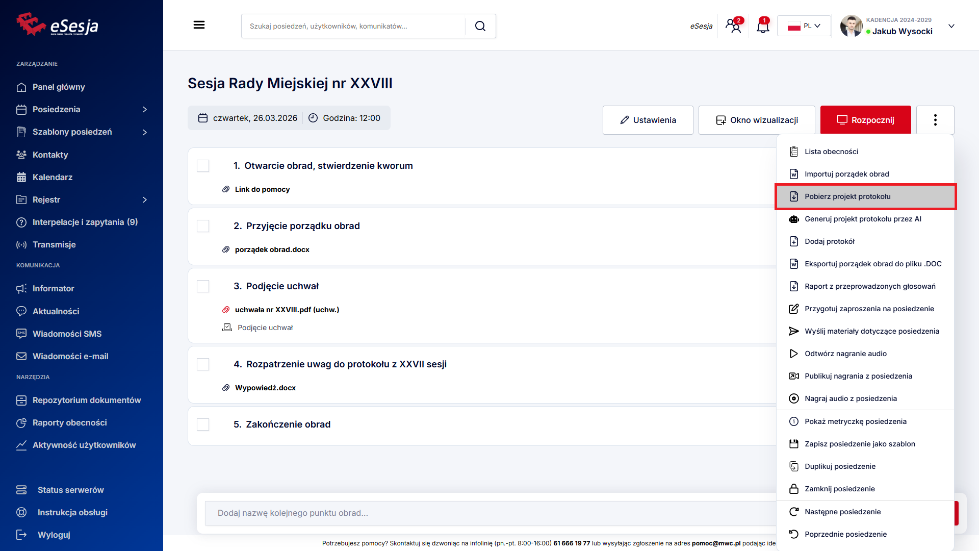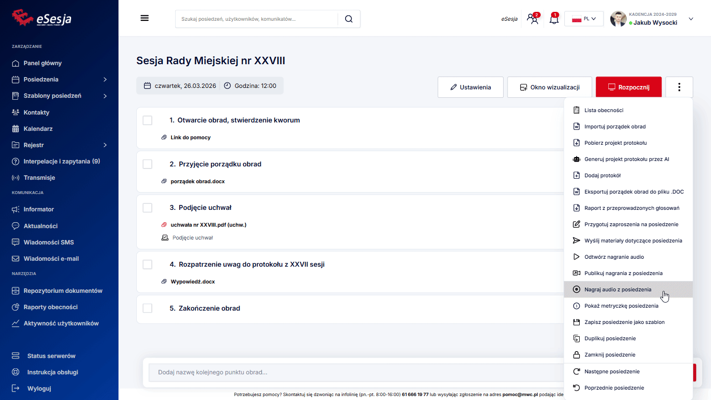 Aby funkcja działała poprawnie w trakcie posiedzenia, należy pamiętać o tym, aby za każdym razem, aktywować punkt porządku obrad, poprzez kliknięcie Aktywuj punkt, gdy już rozpoczniemy posiedzenie.