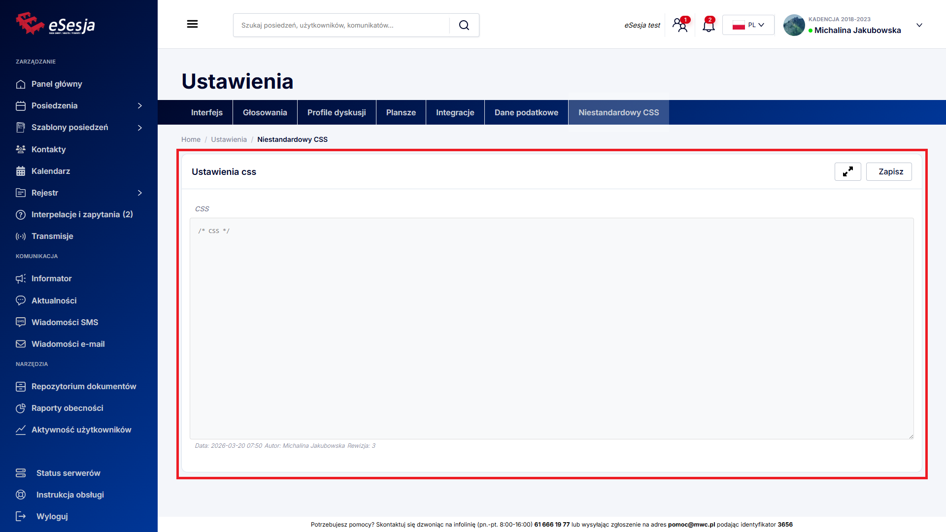 Sekcja dla zaawansowanych użytkowników. Pozwala zmienić styl strony. Wszelkich zmian możemy dokonać wpisując w pole tekstowe odpowiednie wartości kodów. Dla lepszej przejrzystości, możliwe jest rozszerzenie ekranu za pomocą przycisku z ikonkami strzałek. Wprowadzone zmiany zapisujemy przyciskiem Zapisz.