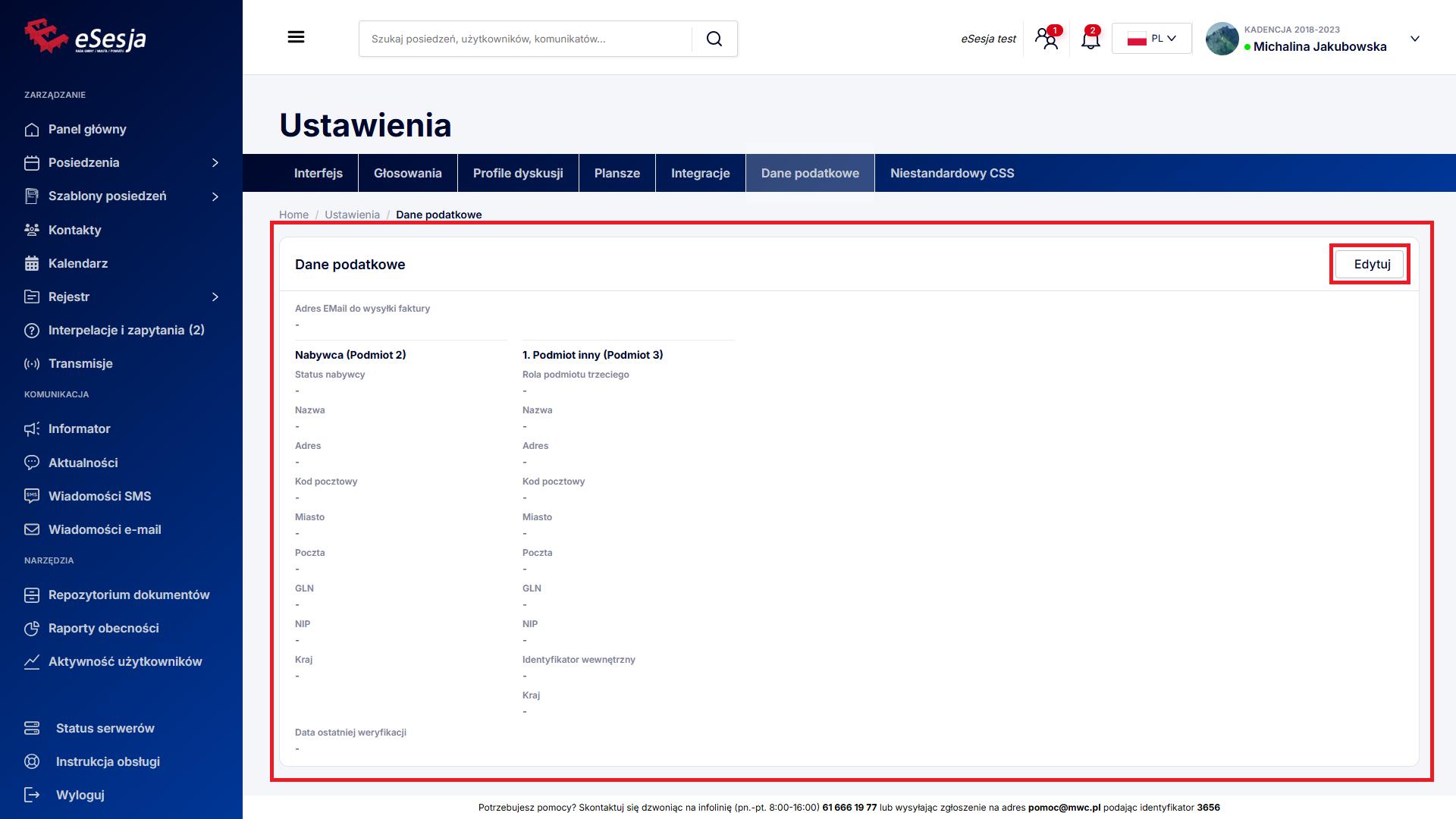 W tej zakładce istnieje możliwość edycji danych podatkowych, które posłużą do przygotowania faktur i przesłania ich w programie KSeF (Krajowy System e-Faktur). Wszelkich zmian dokonać można za pomocą przycisku Edytuj.