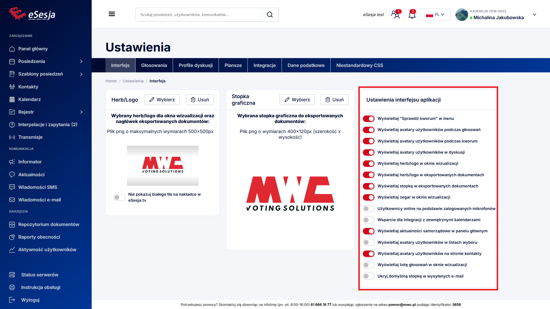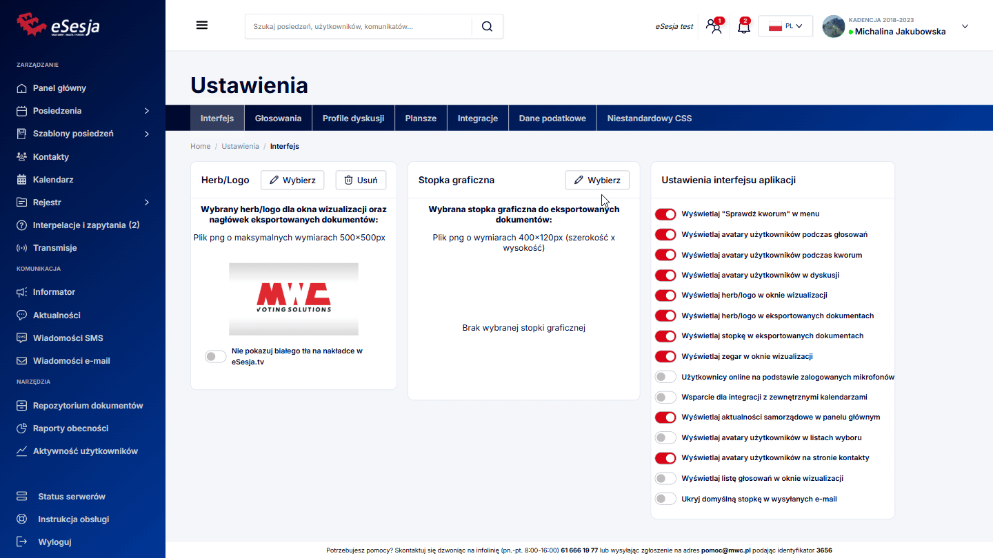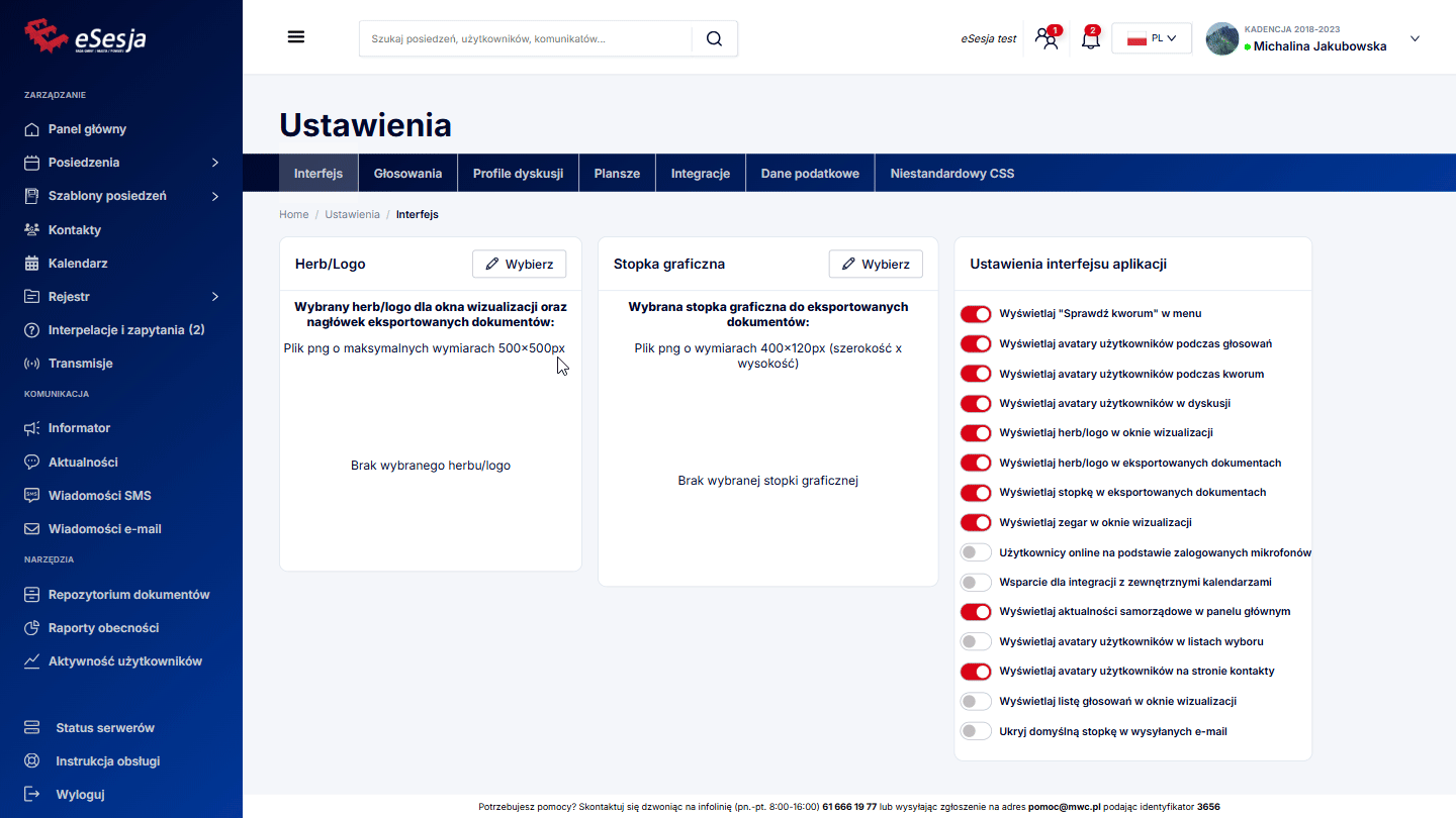 - Wyświetlaj herb/logo w eksportowanych dokumentach – włączona powoduje, że herb/logo jest widoczny/e w eksportowanych z programu eSesja dokumentach, takich jak np. projekt protokołu.