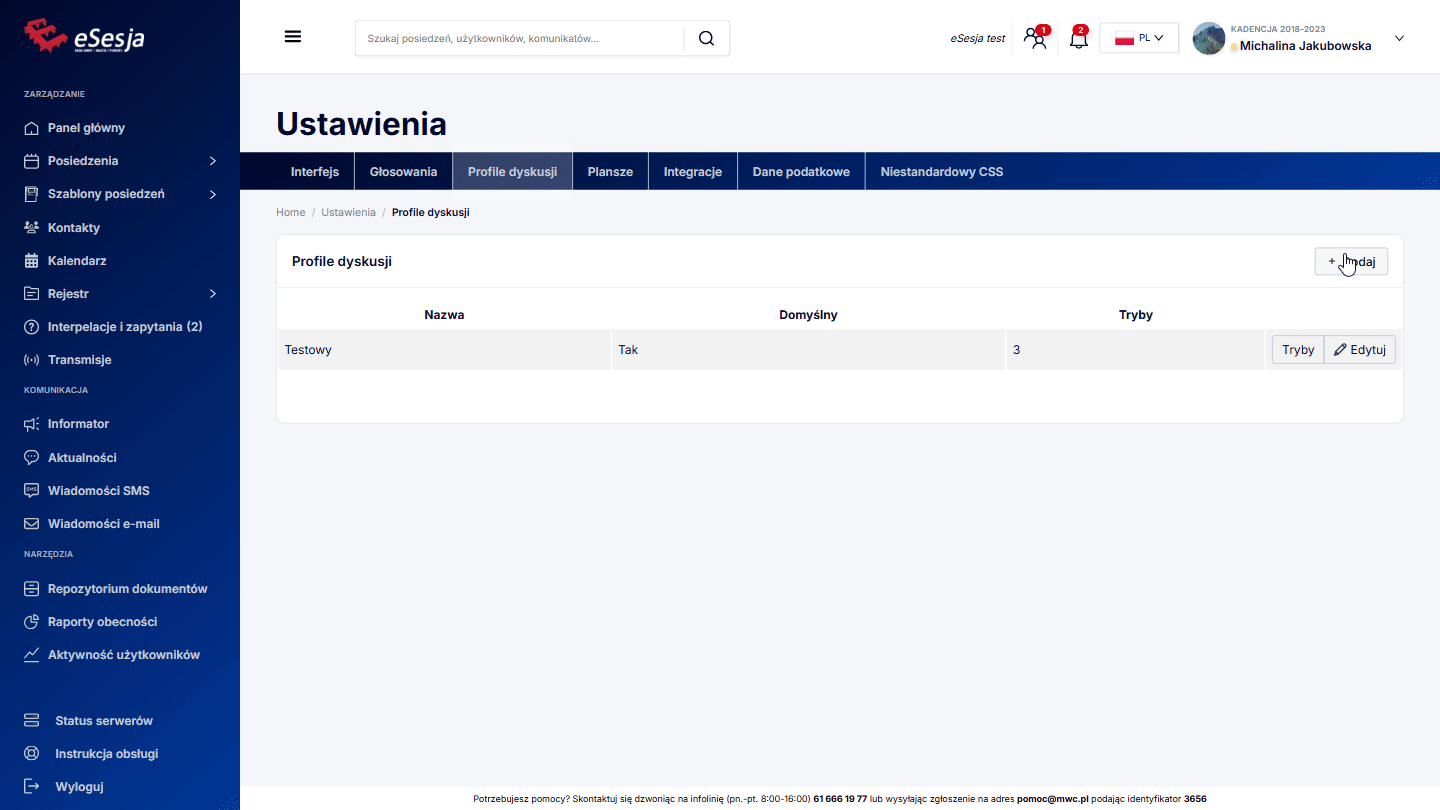 W przypadku chęci skorzystania z profili dyskusji, w pierwszej kolejności rekomendujemy utworzenie profilu domyślnego, tj. takiego, który będzie aktywny dla wszystkich punktów porządku obrad we wszystkich posiedzeniach, o ile nie określimy dla danego punktu innego profilu.