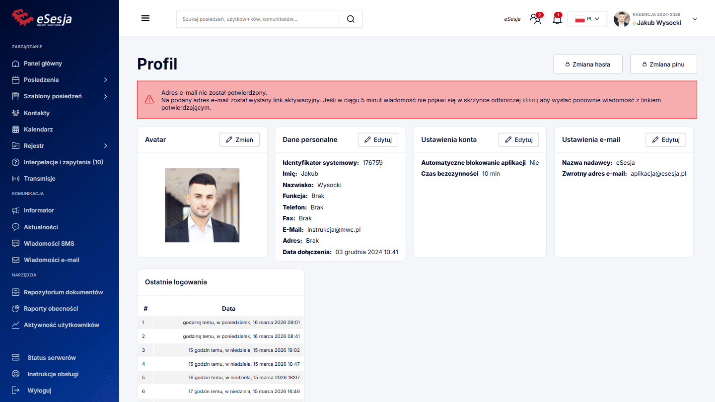 W tej sekcji poprzez kliknięcie przycisku Edytuj jest możliwość zmiany Nazwy nadawcy, z którego przychodzić będą wiadomość e-mail wysyłane z programu eSesja, a także zwrotny adres e-mail. Wszelkie zmiany potwierdzić należy przyciskiem Zapisz.