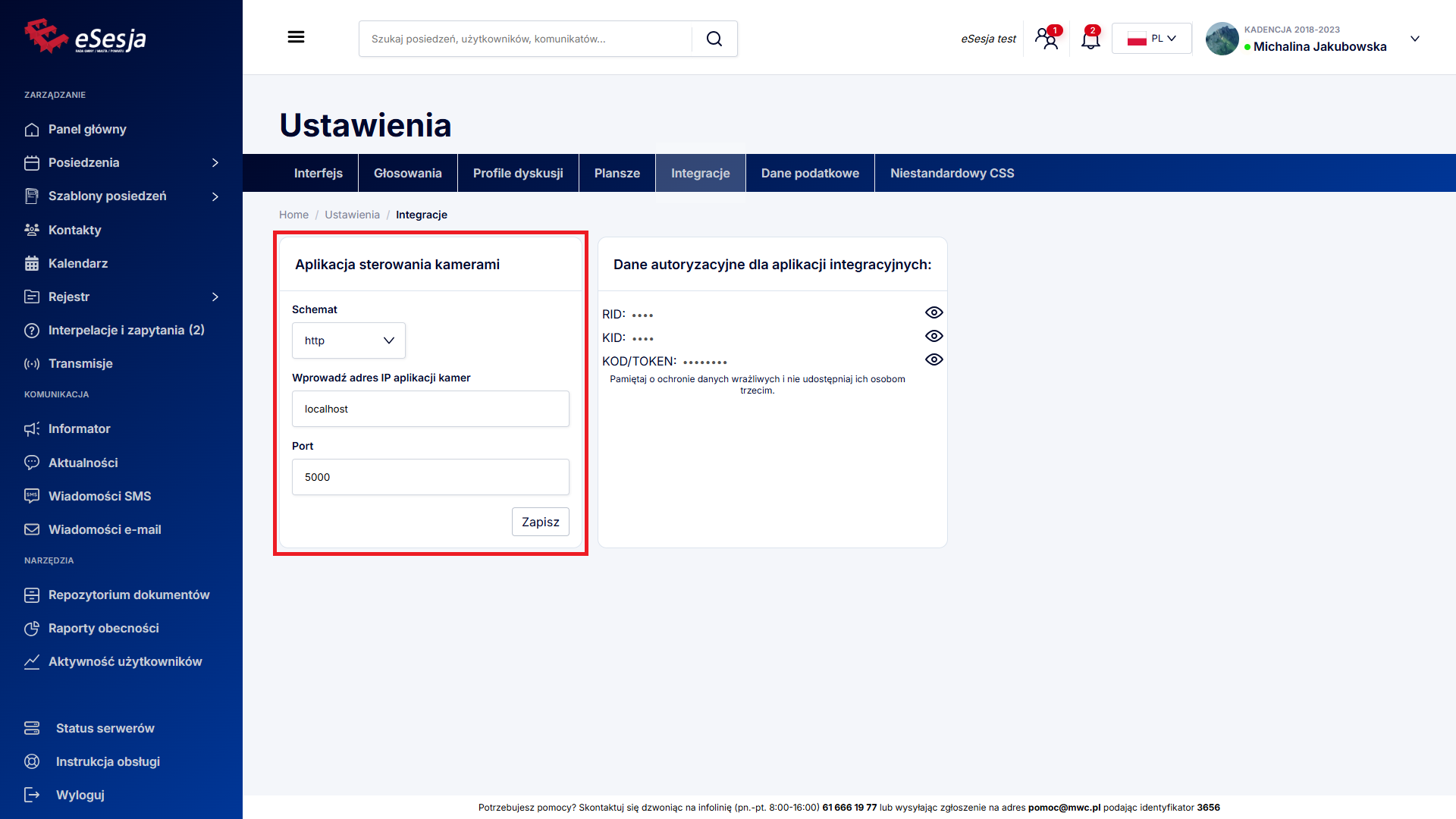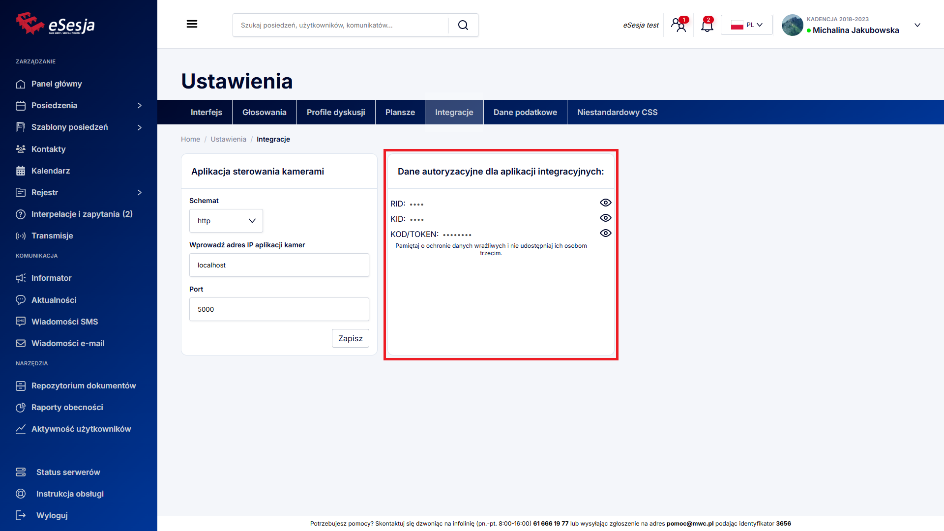 W sekcji Dane autoryzacyjne dla aplikacji integracyjnych jest możliwość podejrzenia kodów do współpracy z systemami, które integrują się z systemem eSesja.