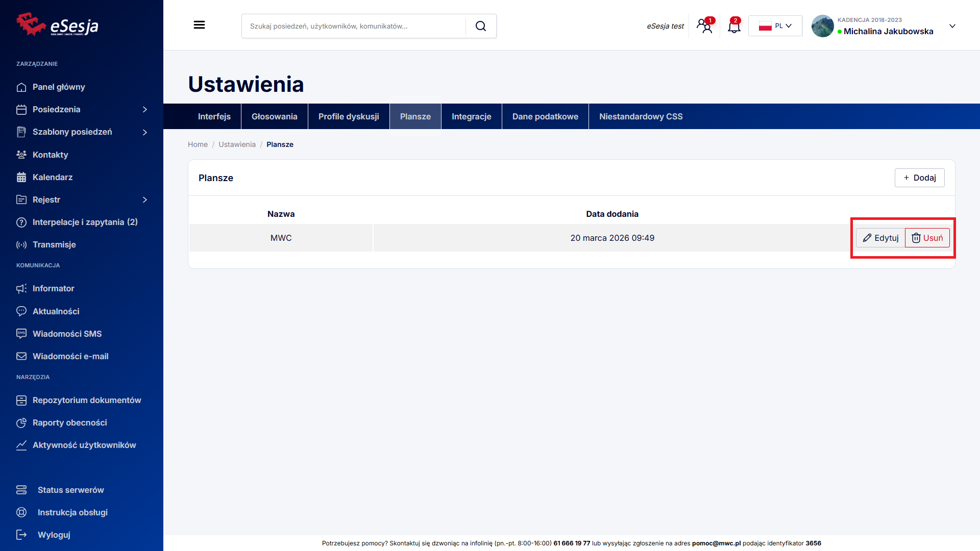 W sekcji istnieje możliwość zmiany danych, takich jak nazwa, opis oraz plik, co jest możliwe po kliknięciu w przycisk Edytuj. Zmiany zapisujemy czerwonym przyciskiem Zapisz. Dodaną planszę możemy również usunąć, korzystając z przycisku Usuń.