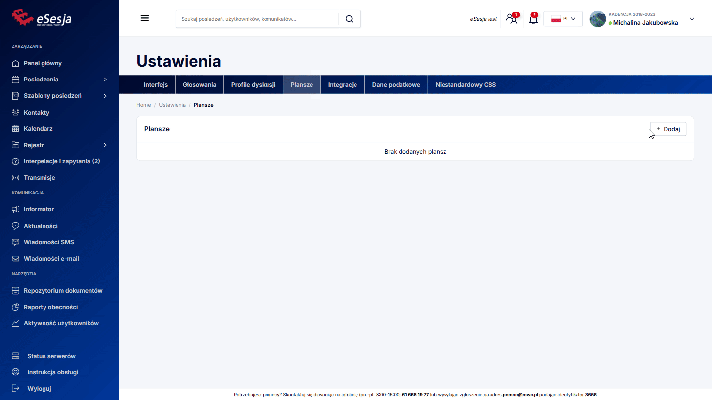 Podczas prowadzenia posiedzenia można wyświetlić plansze, które zaimplementujemy poprzez przycisk Dodaj w sekcji Plansze. W otwartym oknie możemy nadać nazwę planszy, a także uzupełnić pole Opis pomocniczy komponentu dla łatwiejszego rozróżnienia plansz. Funkcja ta pozwala na późniejsze uruchomienie planszy w rozpoczętym posiedzeniu, która widoczna będzie zarówno na Oknie Wizualizacji, jak i na nakładce informacyjnej dodanej do programu, z którego prowadzona jest transmisja obrad na żywo. Planszą może być dowolna przygotowana grafika (Zalecany rozmiar to 1920×1080 lub inny w proporcjach 16:9), która przykładowo może informować o planowanej godzinie rozpoczęcia transmisji. Dodane w tym miejscu plansze możemy uruchomić z poziomu posiedzenia, co zostało opisane w punkcie Plansze.