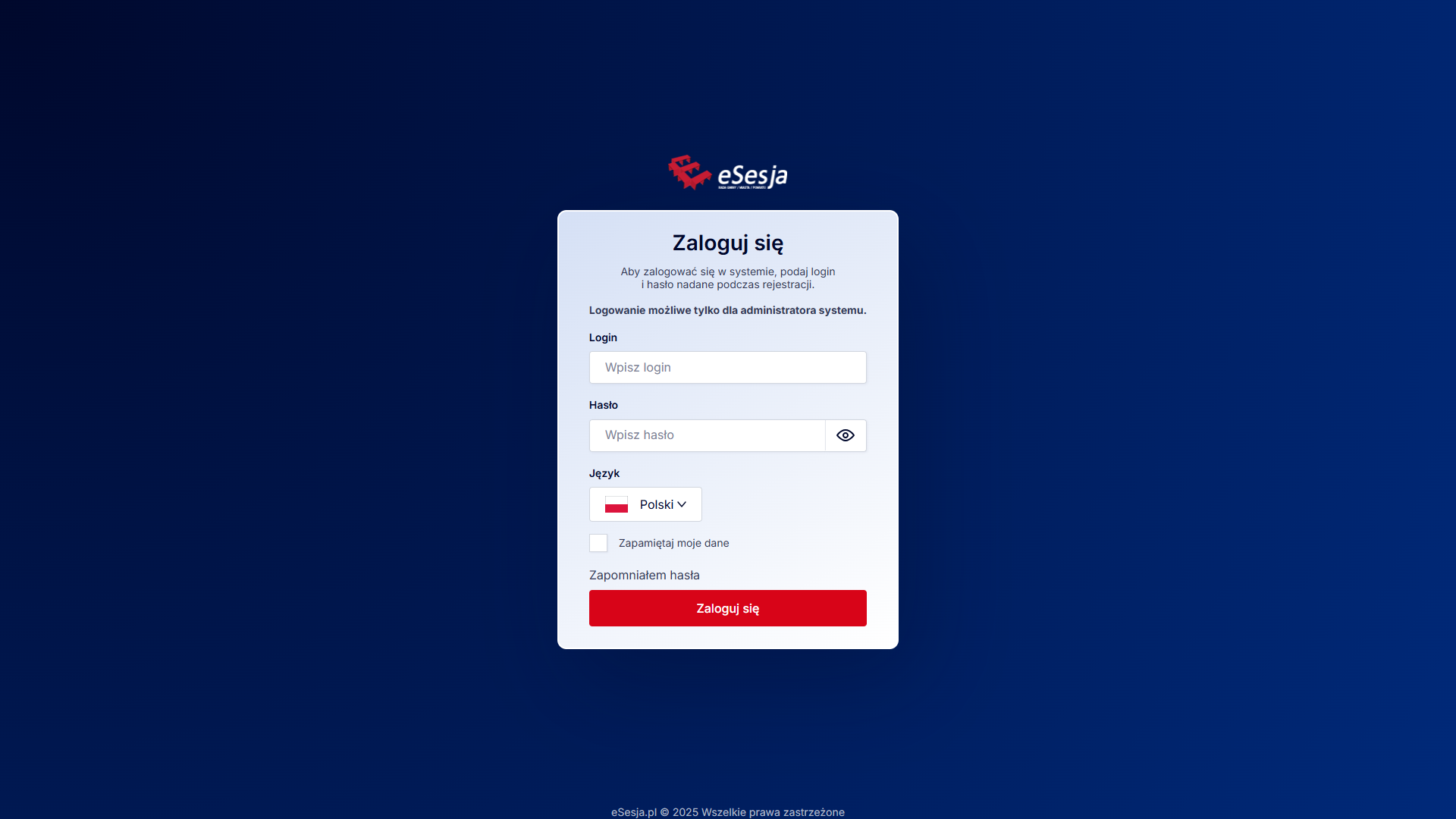 System eSesja jest aplikacją przeglądarkową, logowanie odbywa się na stronie app.esesja.pl. Aby przyspieszyć dostęp do aplikacji, możliwym jest zaznaczenie opcji Zapamiętaj moje dane. Po jej zaznaczeniu włączymy funkcję autologowania do systemu.
