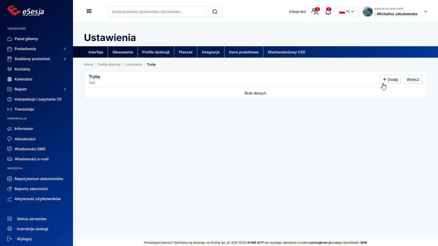 W kolejnym kroku, po wybraniu przycisku Tryby, a następnie + Dodaj, przechodzimy do szczegółowej konfiguracji poszczególnych trybów wypowiedzi. W systemie eSesja mamy do dyspozycji 3 tryby dyskusji: Proszę o głos, Ad vocem i Wniosek Formalny. Każdy z nich możemy skonfigurować według własnych potrzeb.