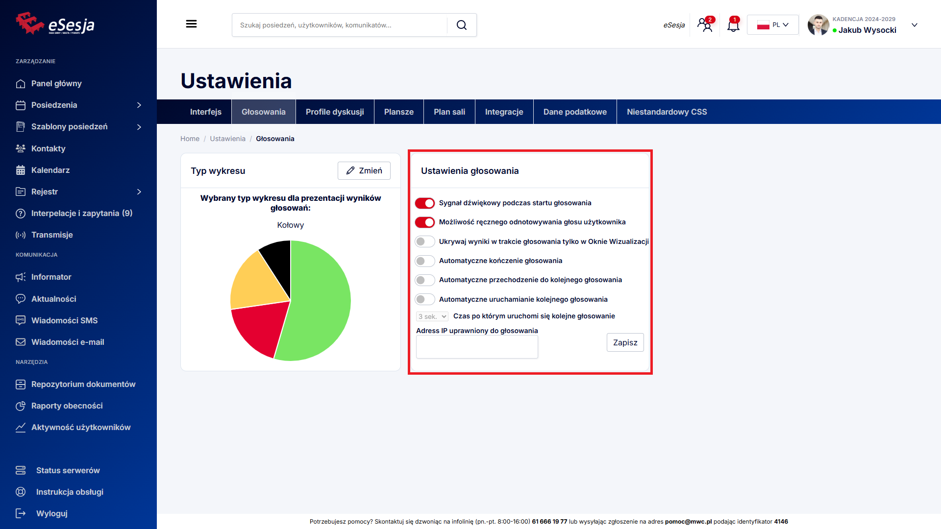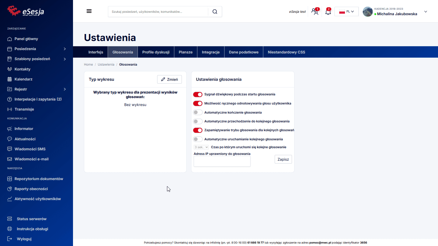 Jawność głosowań – opcja umożliwiająca wybór między Tajnym, a Jawnym głosowaniem. Domyślnie głosowania są ustawione jako Jawne.