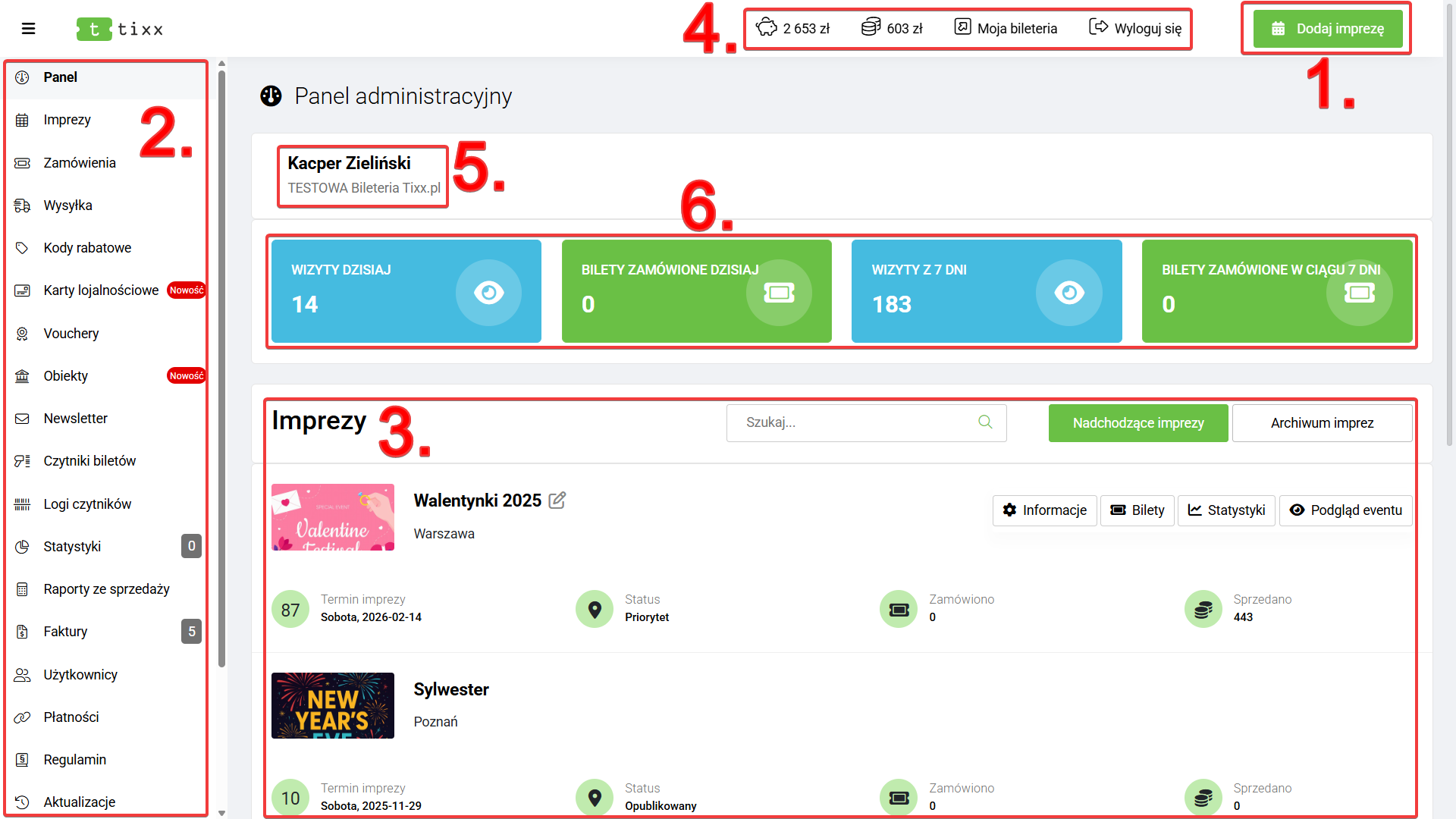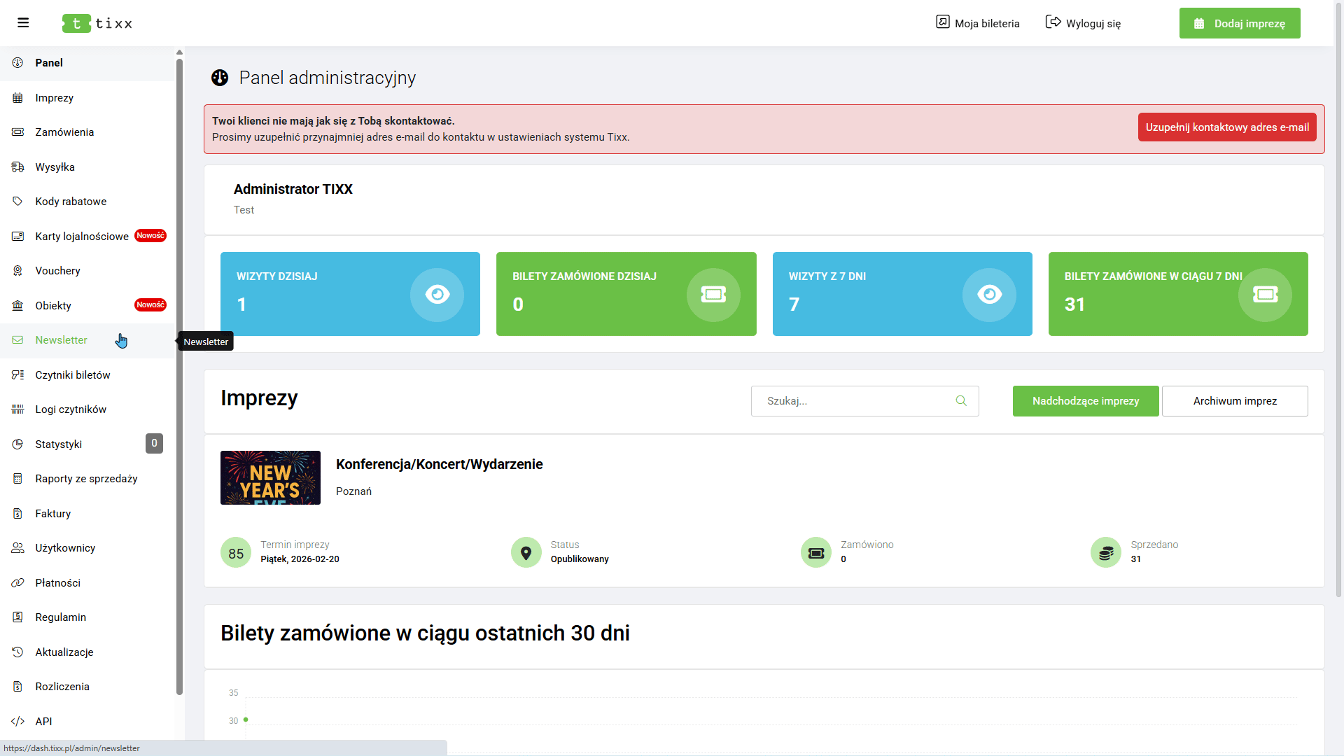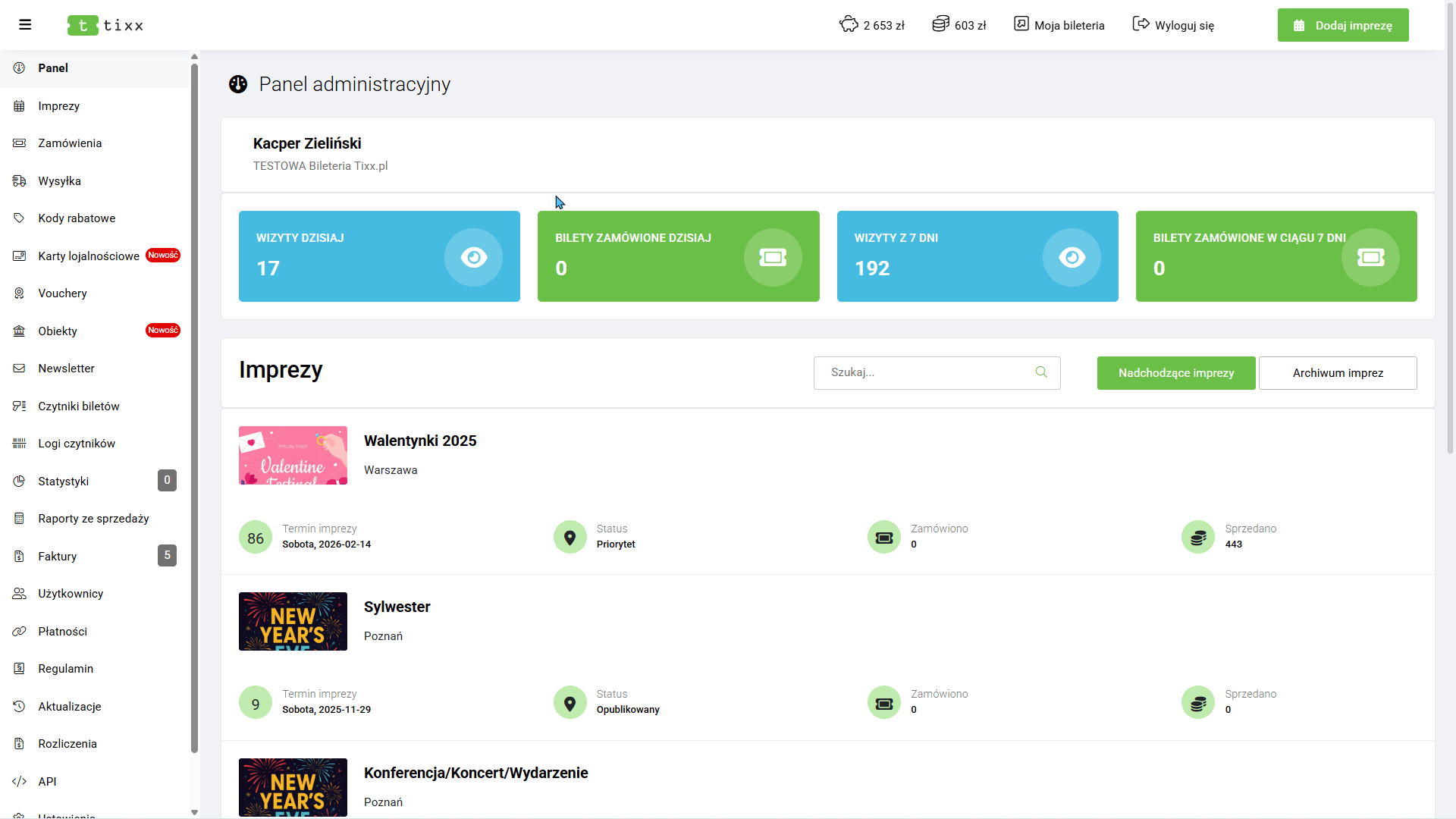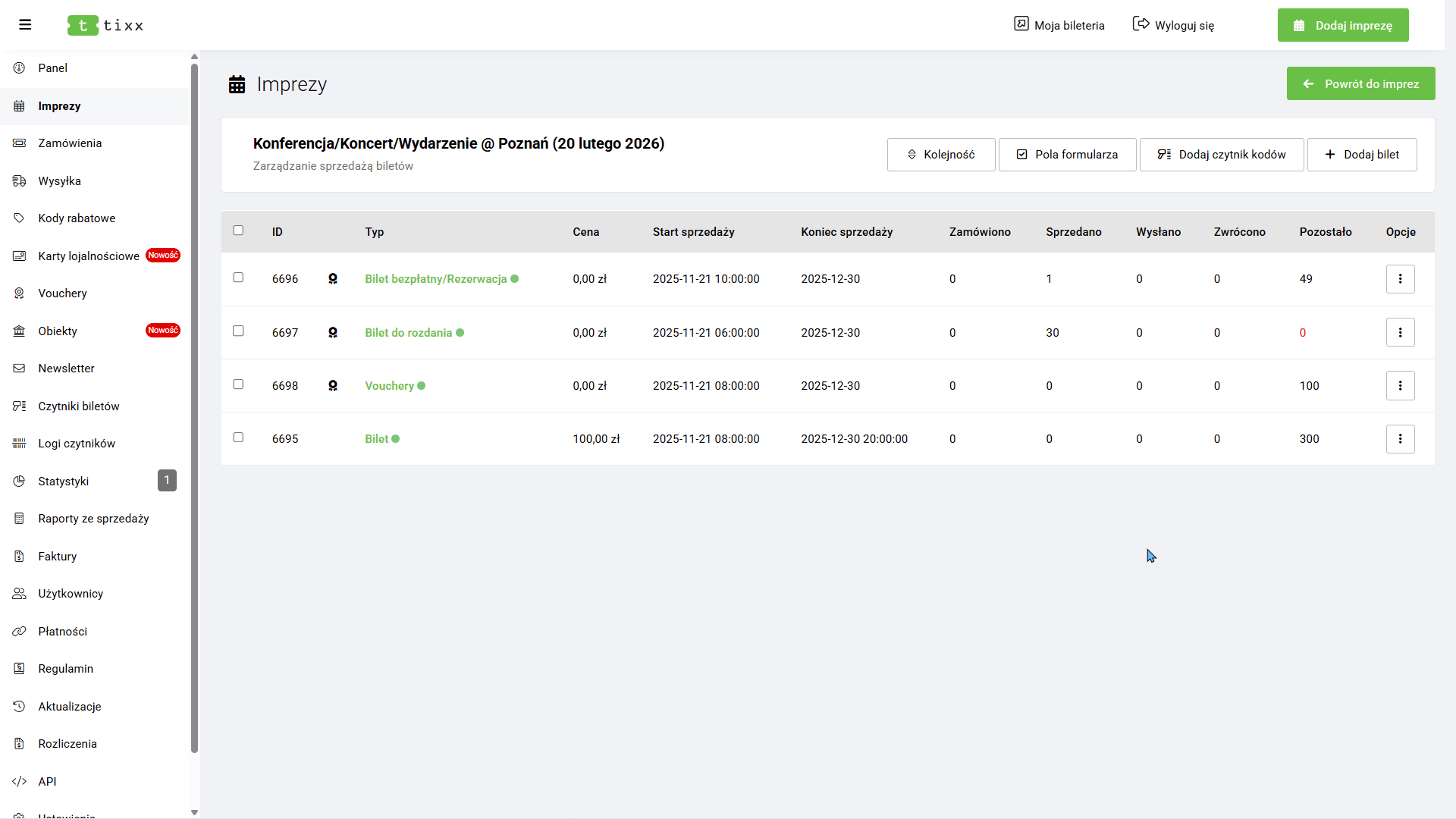 Kolejnym krokiem w tworzeniu kompletnego wydarzenia jest dodanie do niego biletów. Aby to zrobić: przejdź do sekcji „Imprezy”, najedź kursorem na wybrane wydarzenie (lub kliknij trzy kropeczki) i wybierz opcję „Bilety”.