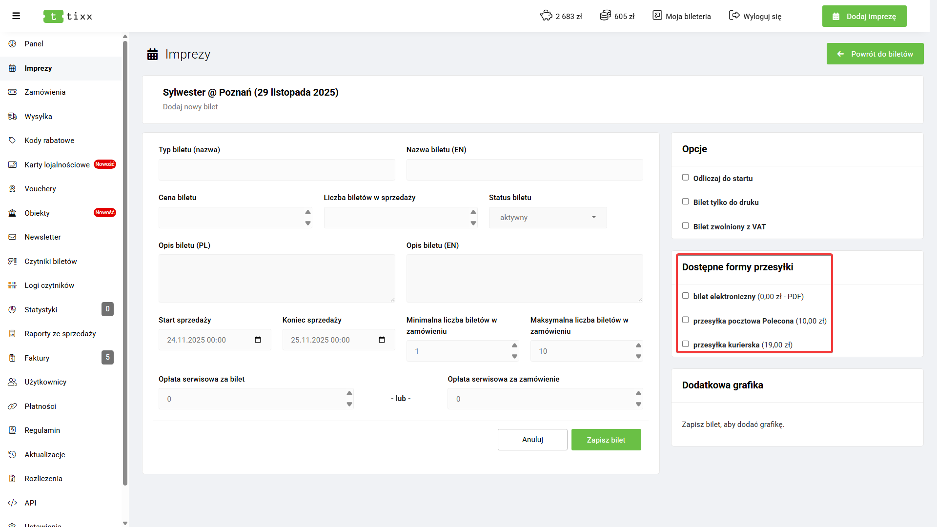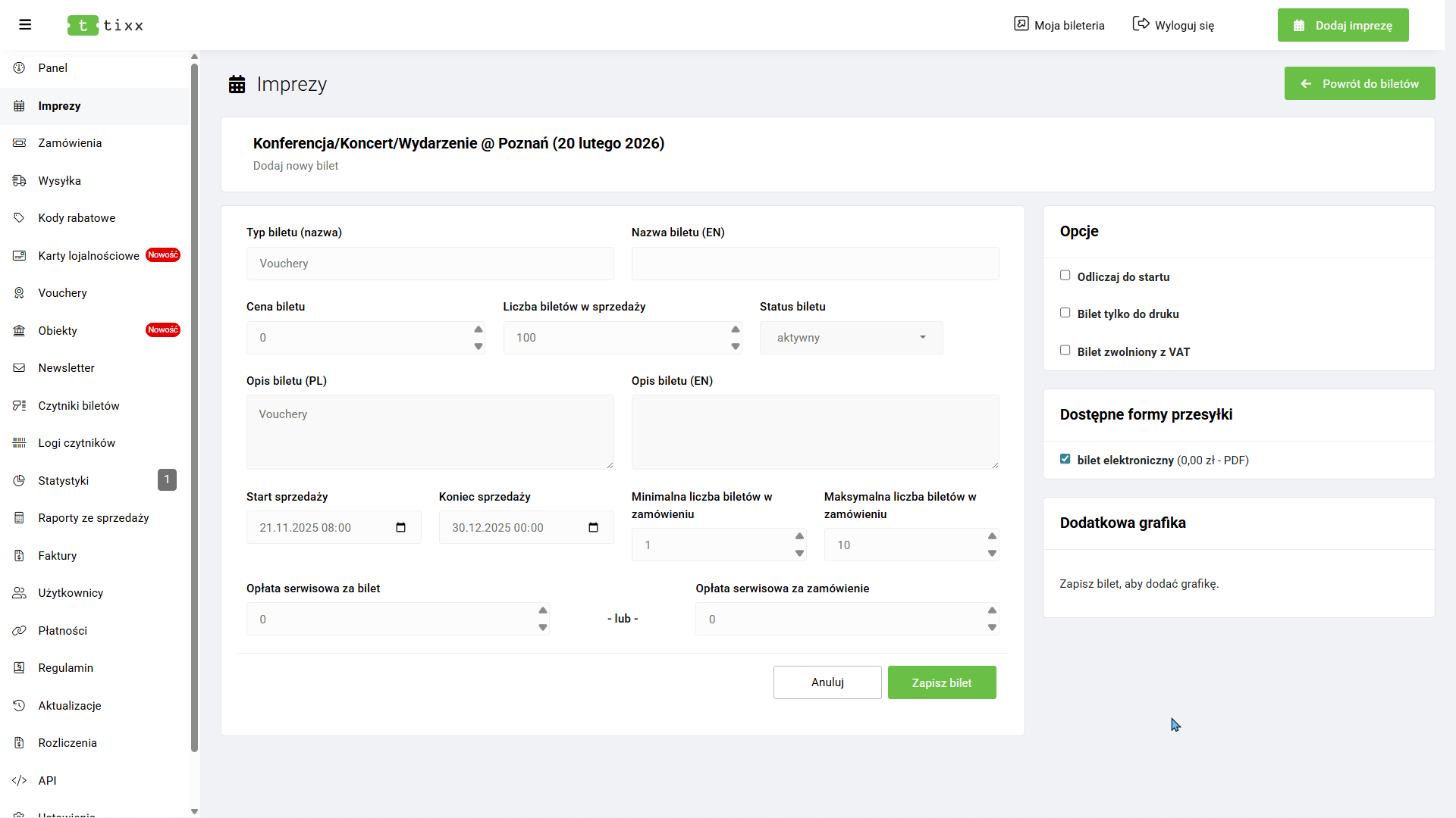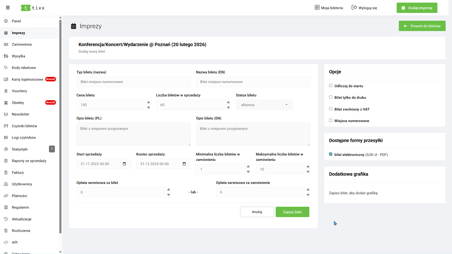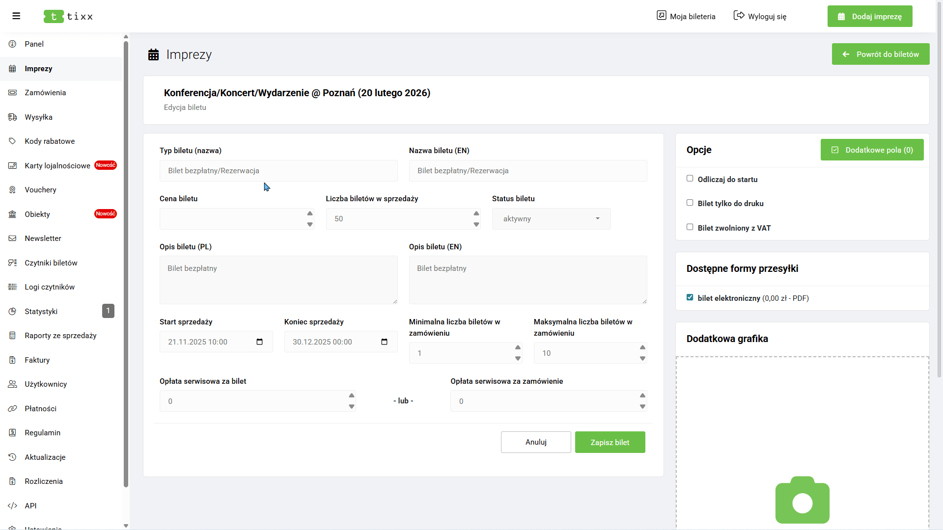 Następnie w prawej górnej części panelu wybierz opcję „Dodaj bilet” i uzupełnij formularz:
