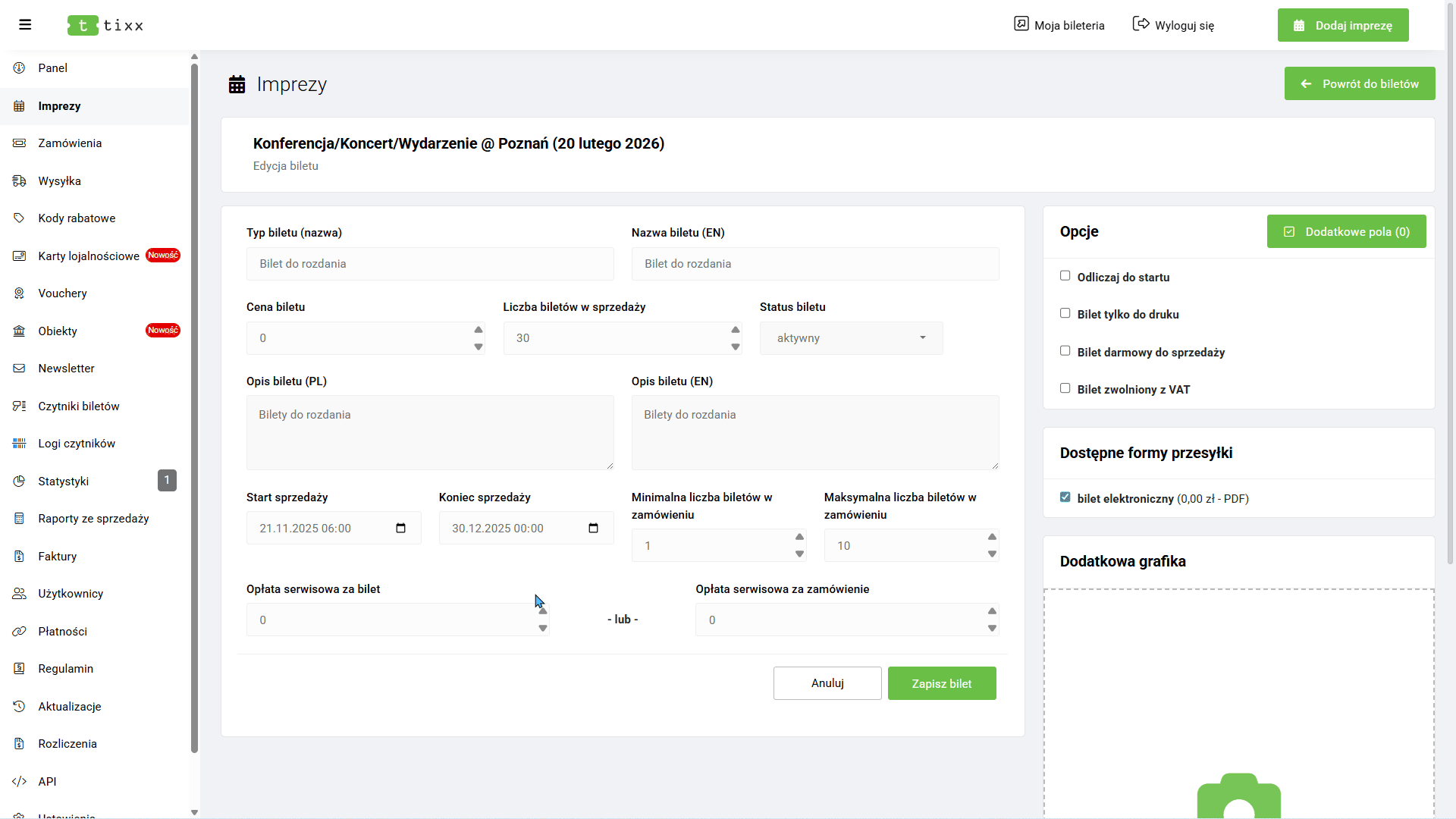 - Bilet tylko do druku (Włączenie tej pozycji uniemożliwia zakup biletu internetowo. Organizator w ten sposób zachowuje sobie możliwość wydrukowania własnej puli biletów i rozdysponowania ich osobiście/przekazania kasie fiskalnej w przypadku sprzedaży prowadzonej stacjonarnie)