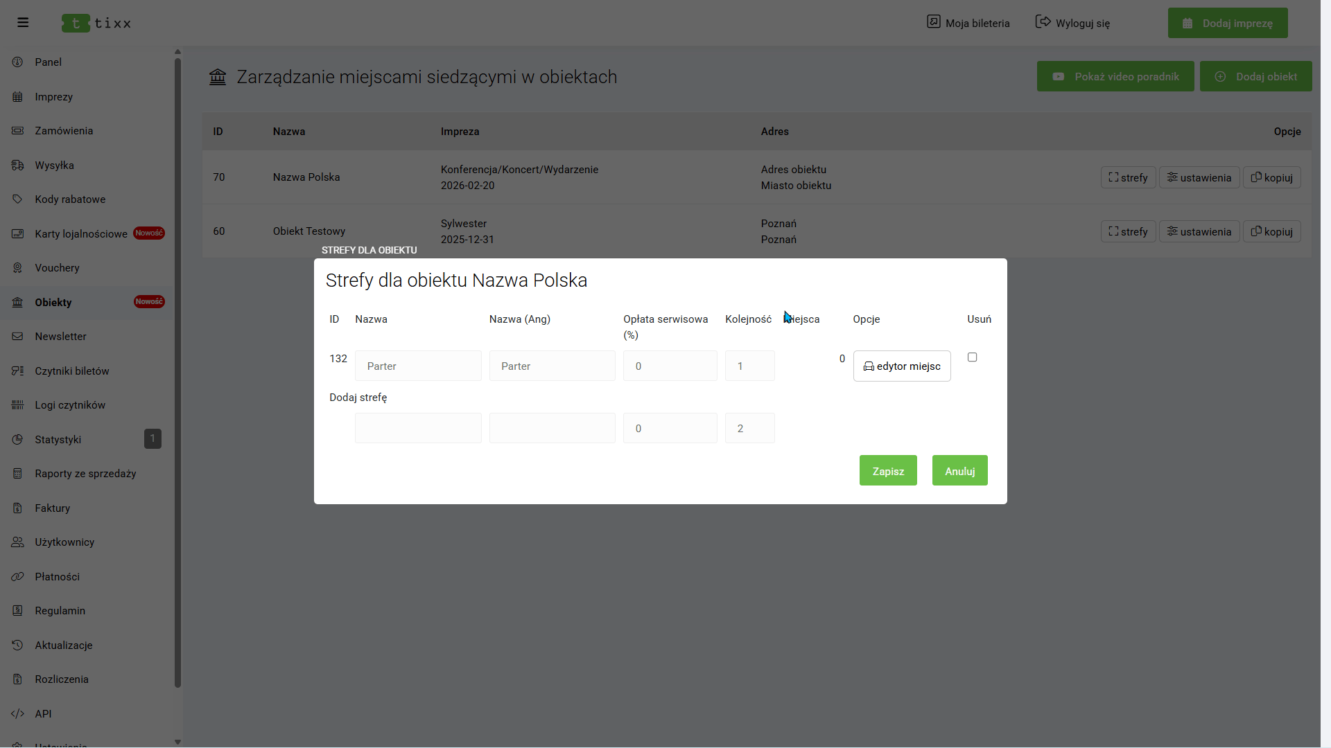 Bilet po uruchomieniu sprzedaży i przy pojawieniu się pierwszego aktywnego zamówienia, NIE MA MOŻLIWOŚCI zmiany ceny biletu i wysokości opłaty serwisowej. Rekomendujemy by zmiana informacji/ceny biletu wiązała się z zamknięciem sprzedaży aktualnego biletu i uruchomieniu drugiej puli sprzedażowej.