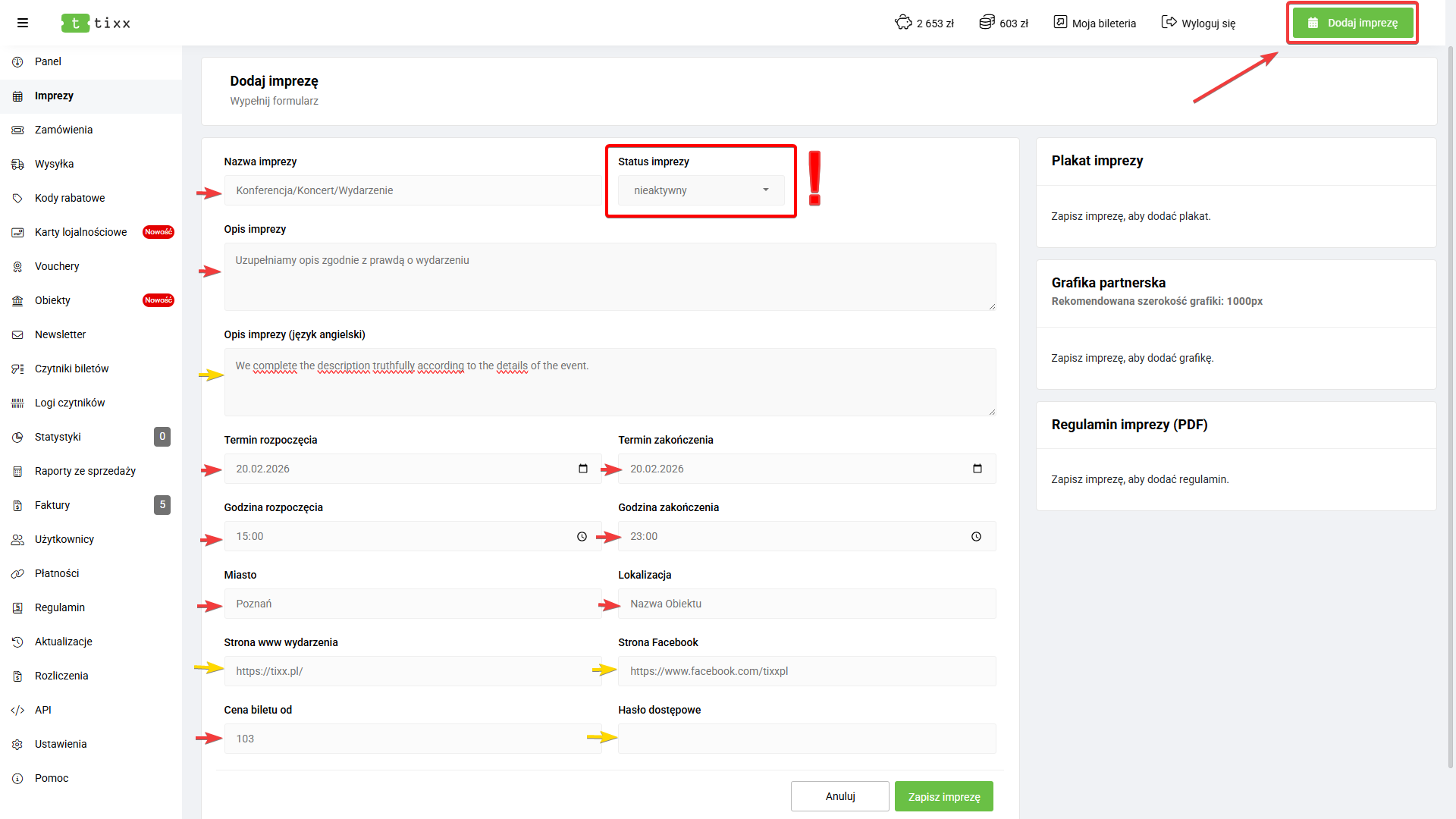 Przycisk „Dodaj Imprezę” przekierowuję do formularza, który wymaga od nas uzupełnienia poniższych pozycji, oznaczonych czerwonym wskaźnikiem, zgodnie z powyższą wizualizacją: