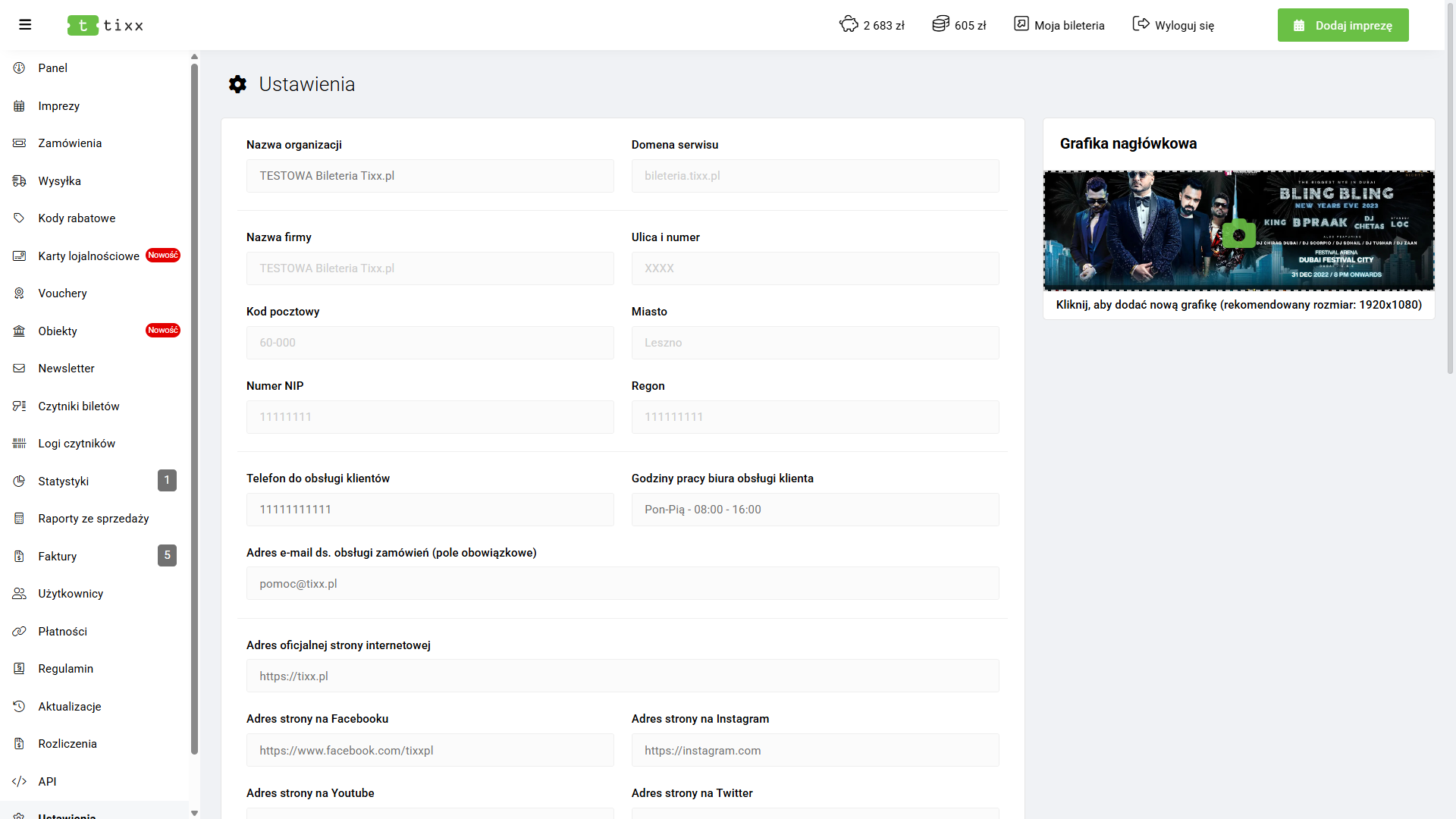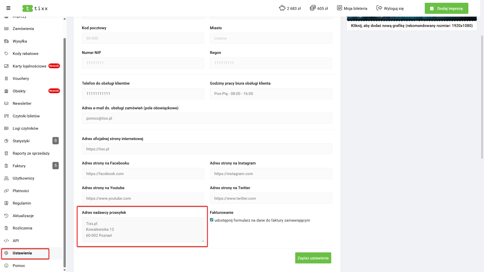 Sekcja Ustawienia zawiera informacje o domenie serwisu oraz działalności prowadzącej sprzedaż biletów. Dodatkowo umożliwia zarządzanie następującymi elementami: