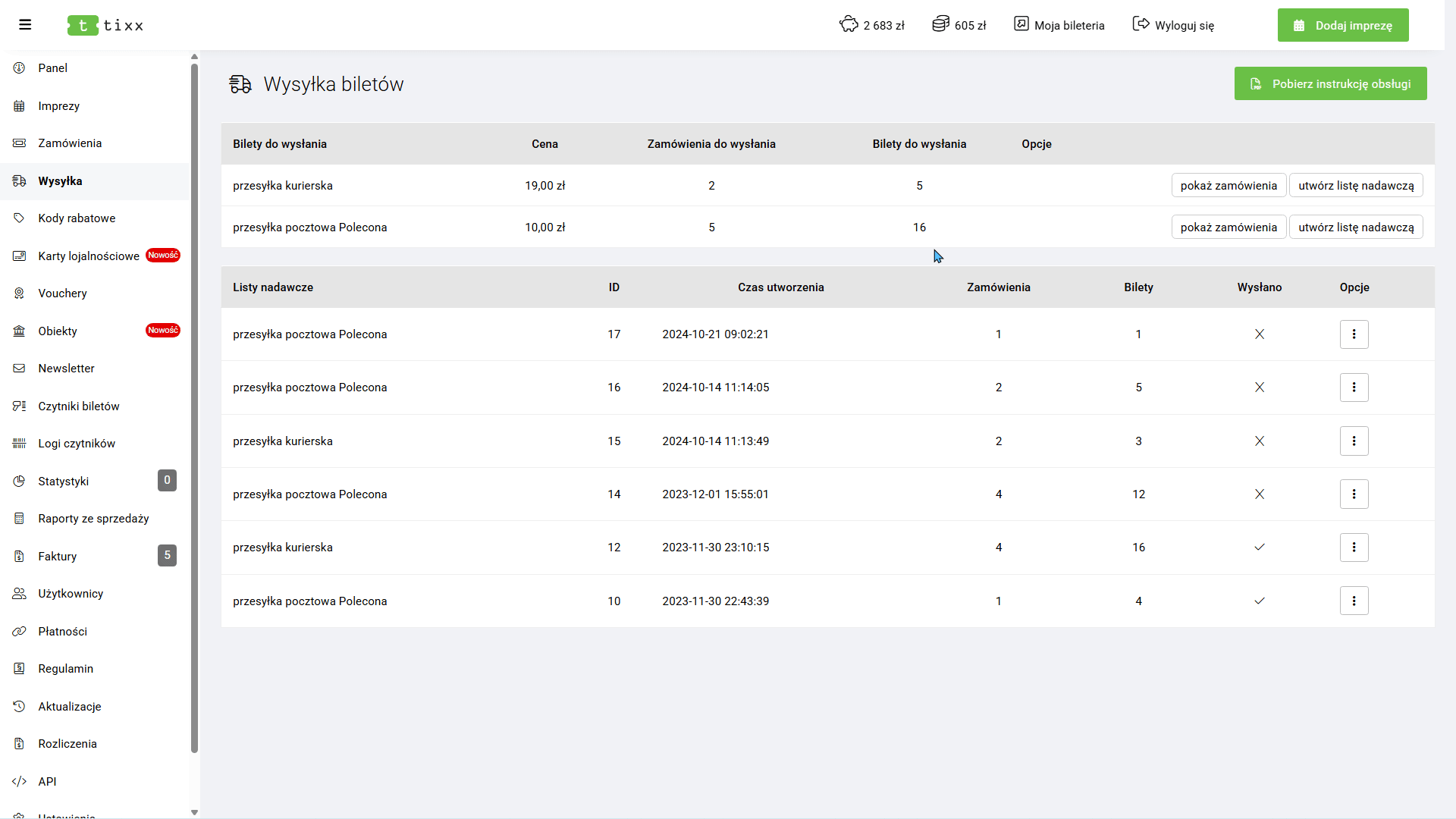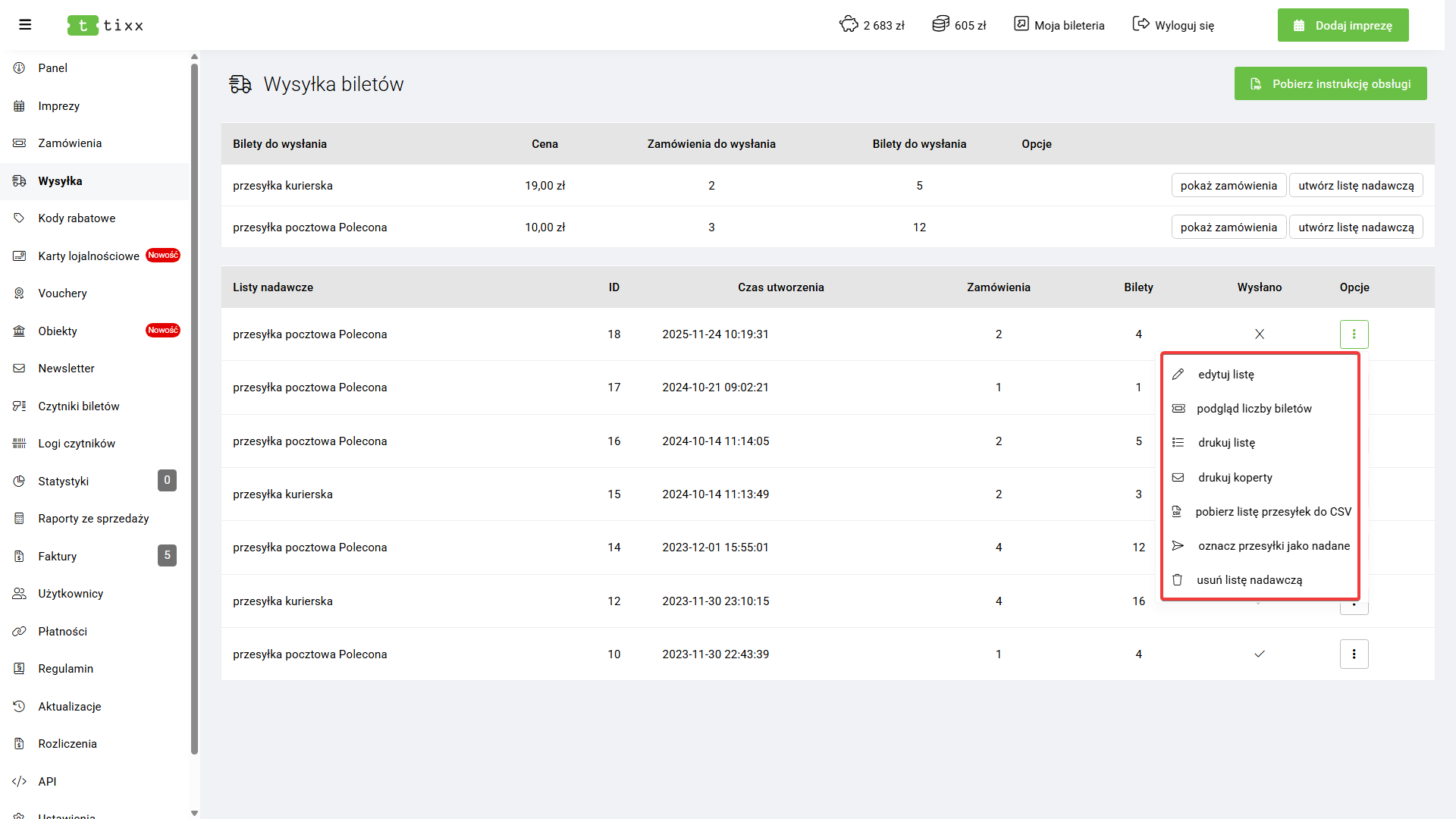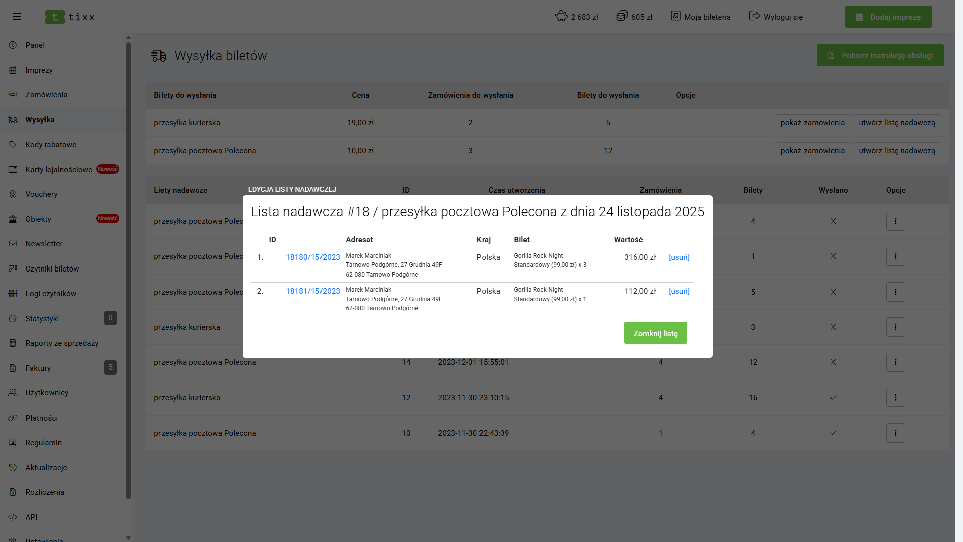 - Usuń listę nadawczą – usuwa listę nadawczą oraz przywraca wszystkie przypisane zamówienia do sekcji Bilety do wysłania