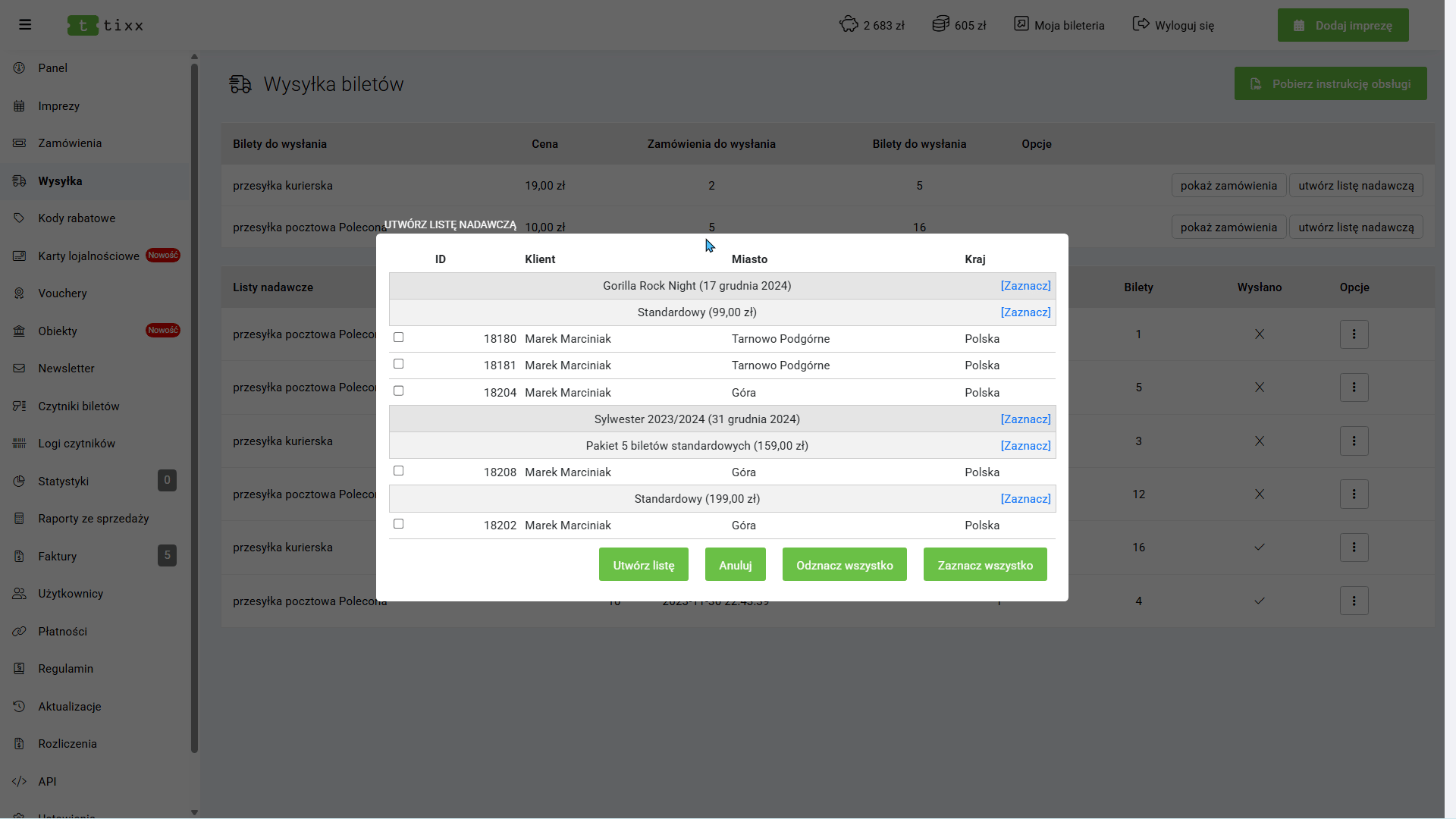 - Podgląd liczby biletów – pokazuje liczbę oraz rodzaj biletów, które należy przygotować do wysyłki dla danej listy
