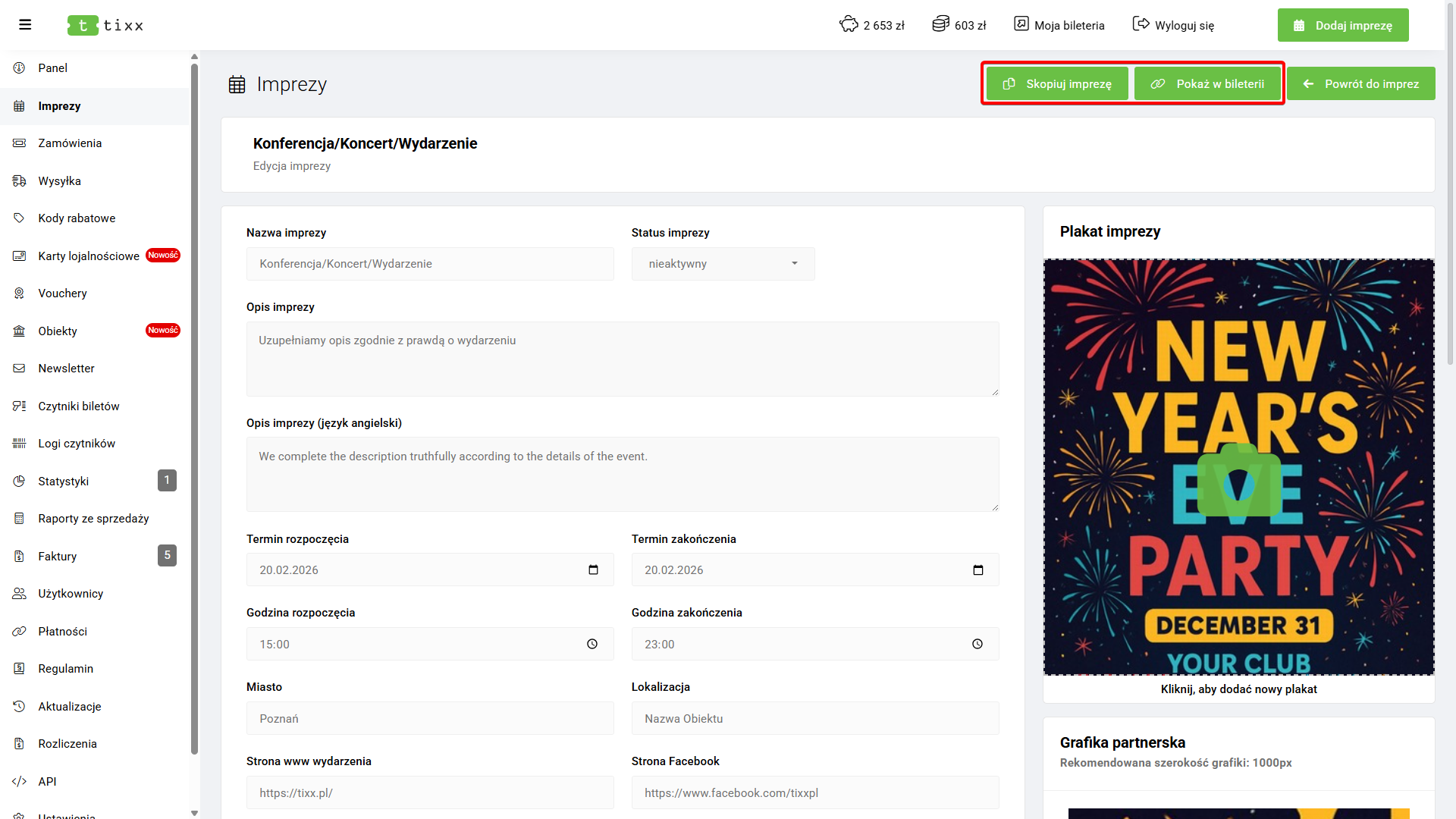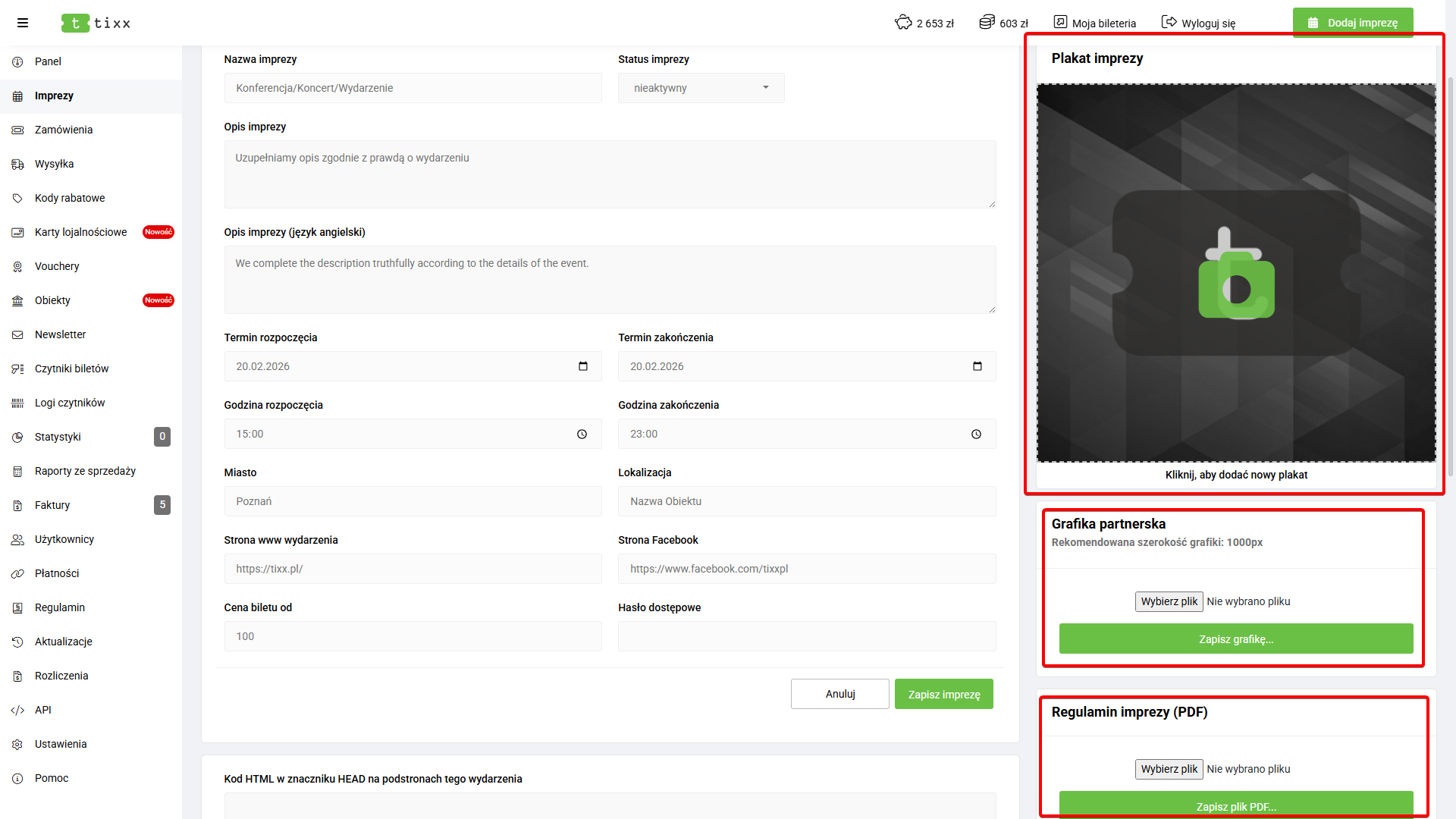 Impreza domyślnie otrzymuję status „nieaktywny”. Oznacza to, że wydarzenie nie zostało opublikowane, a organizator zyskuję przestrzeń do przygotowania oprawy graficznej wydarzenia, a także dodania m.in biletów.
