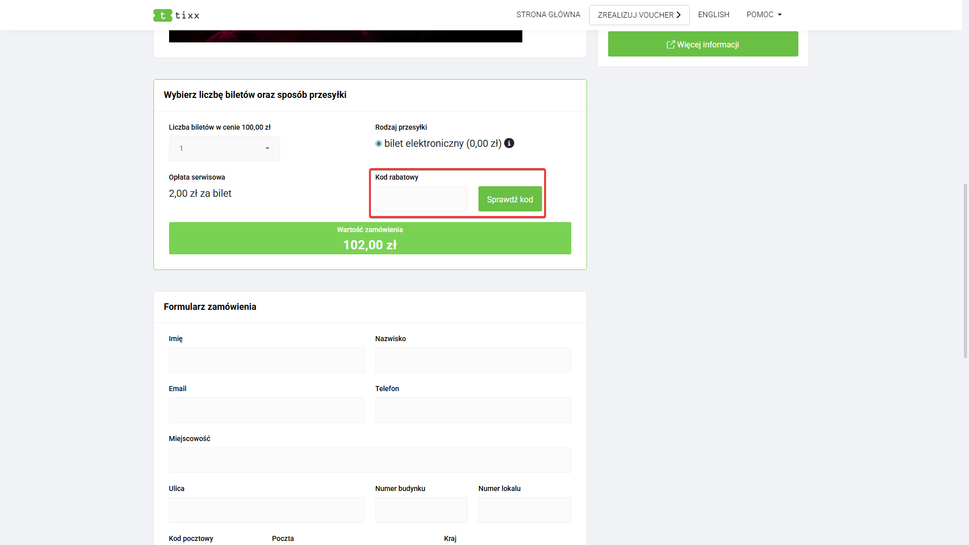 Do zapisania biletu, niezbędne jest zaznaczenie dostępnej formy przesyłki (Po prawej stronie ekranu).