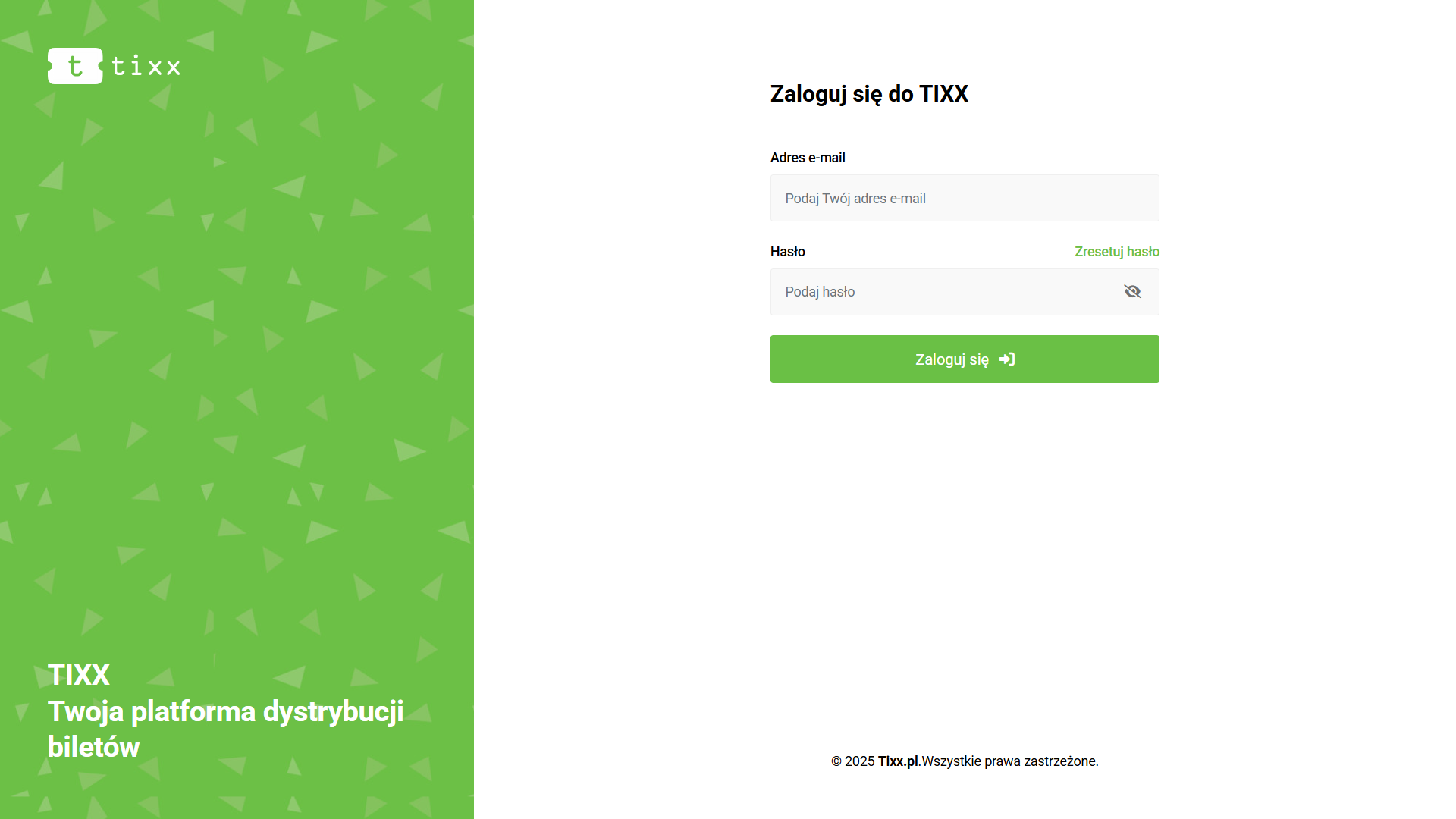 System Tixx jest aplikacją przeglądarkową. Logowanie odbywa się na stronie dash.tixx.pl za pomocą wcześniejszych otrzymanych loginu i hasła.