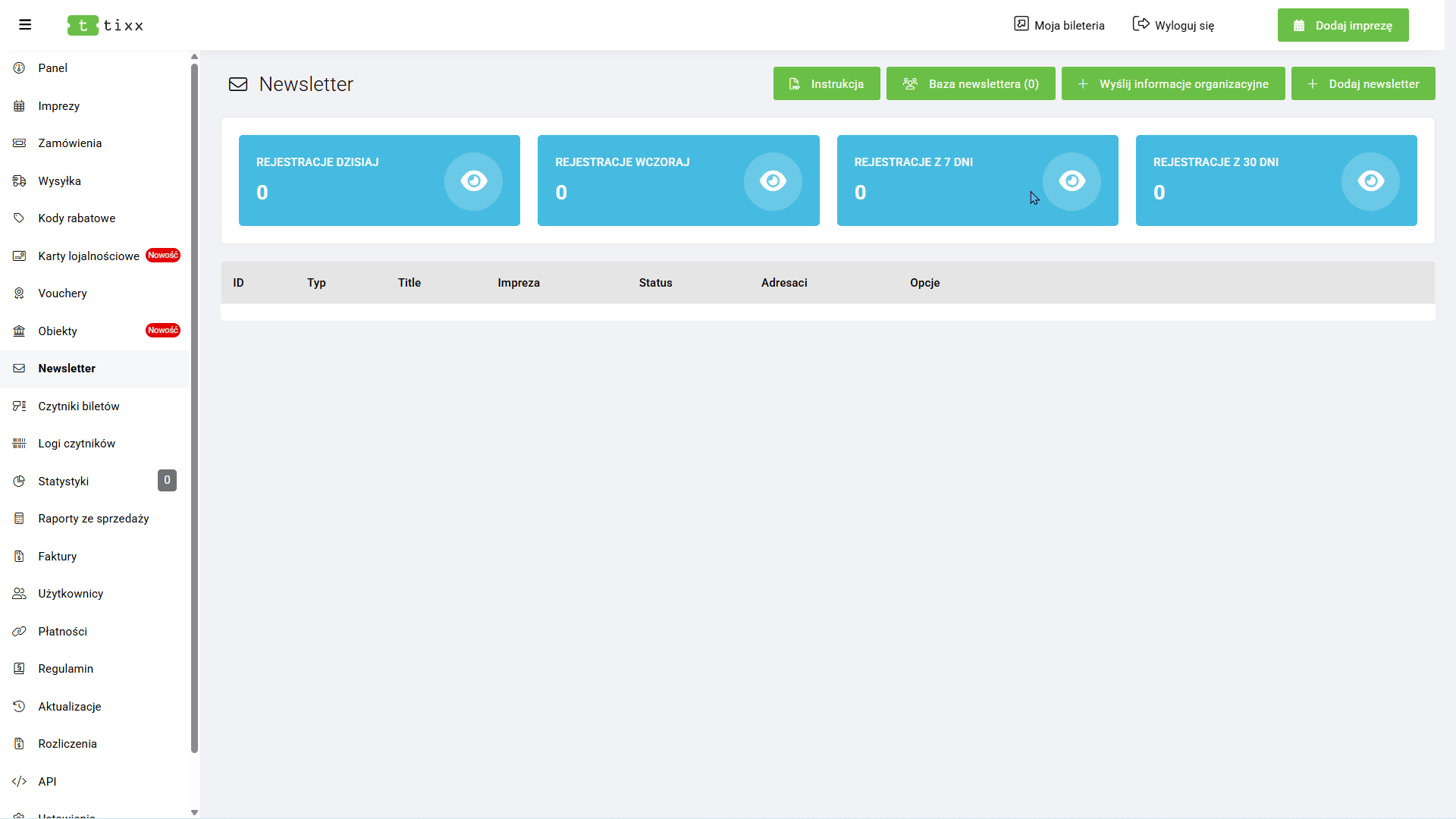 - Pozycja „Dodaj Imprezę”, która otwiera procedurę uzupełnienia danych o imprezie.