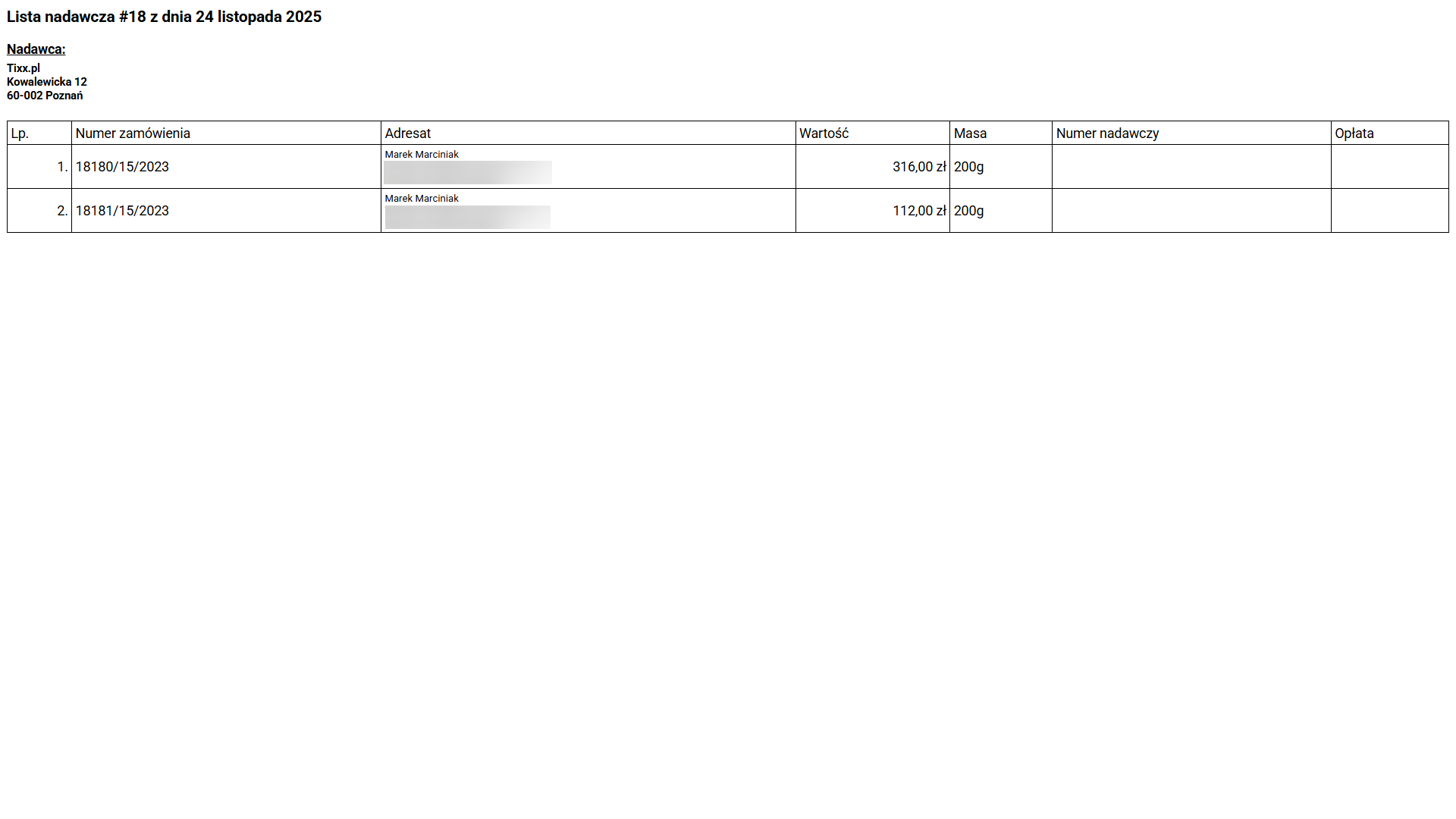 Na liście nadawczej naniesione są numery zamówień, adresy przesyłek, ich wartość oraz domyślna masa.