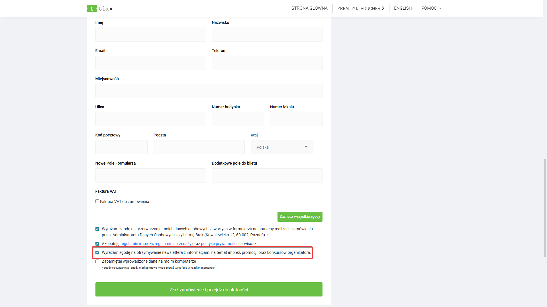- adres e-mail do obsługi zamówień – pole obowiązkowe,