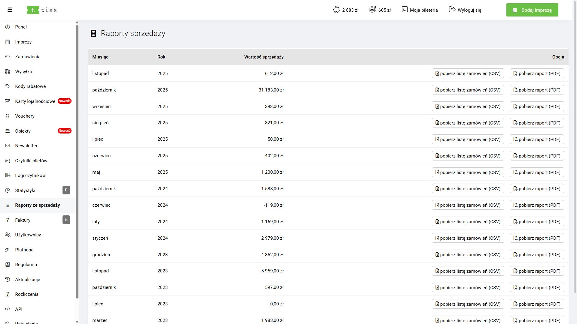Sekcja Raporty sprzedażowe umożliwia pobranie miesięcznych zestawień dotyczących wszystkich zamówień dokonanych w systemie. Raporty są automatycznie generowane na podstawie rzeczywistych transakcji, które pojawiają się w panelu, a następnie archiwizowane w podziale na miesiące.