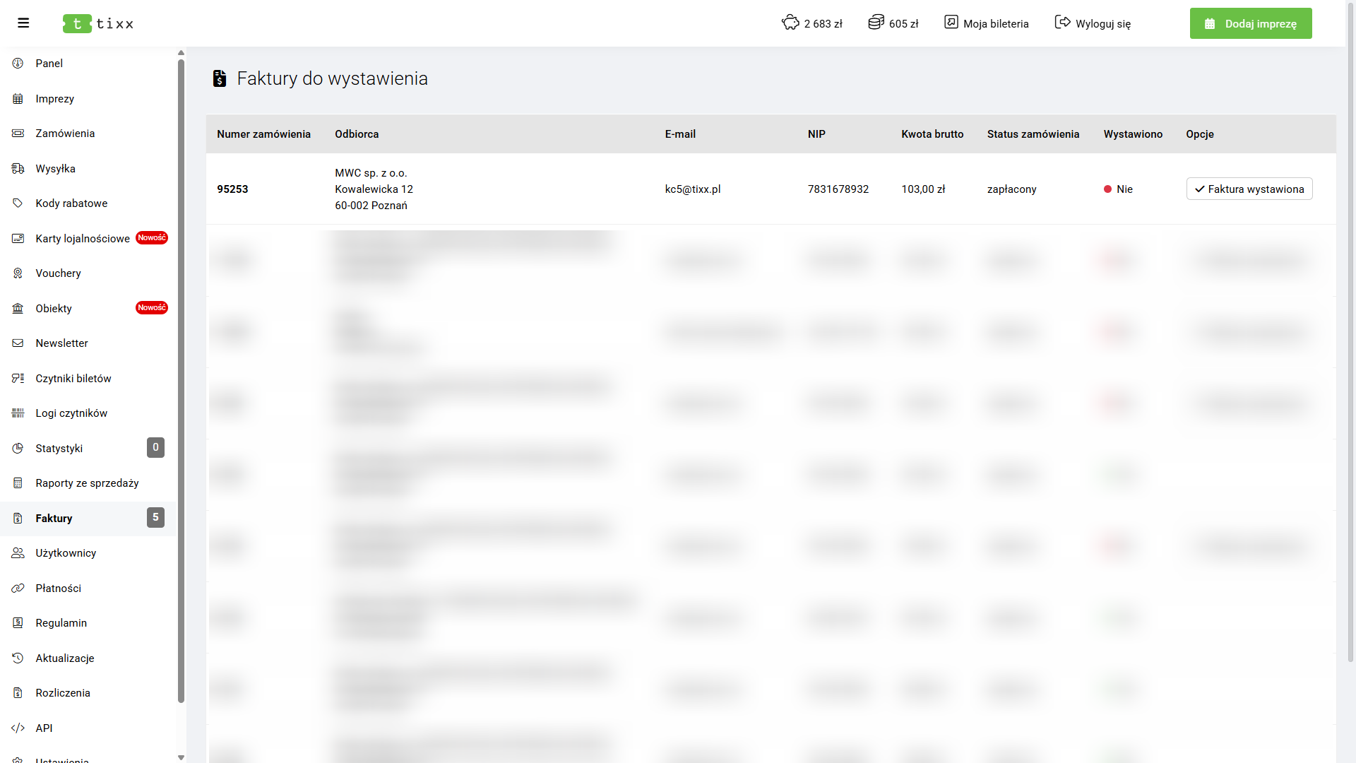 Zakładka Faktury przechowuje dane do faktury podane przez kupujących. Informacje te są potrzebne organizatorowi, aby samodzielnie wystawić fakturę w swoim zewnętrznym programie księgowym.