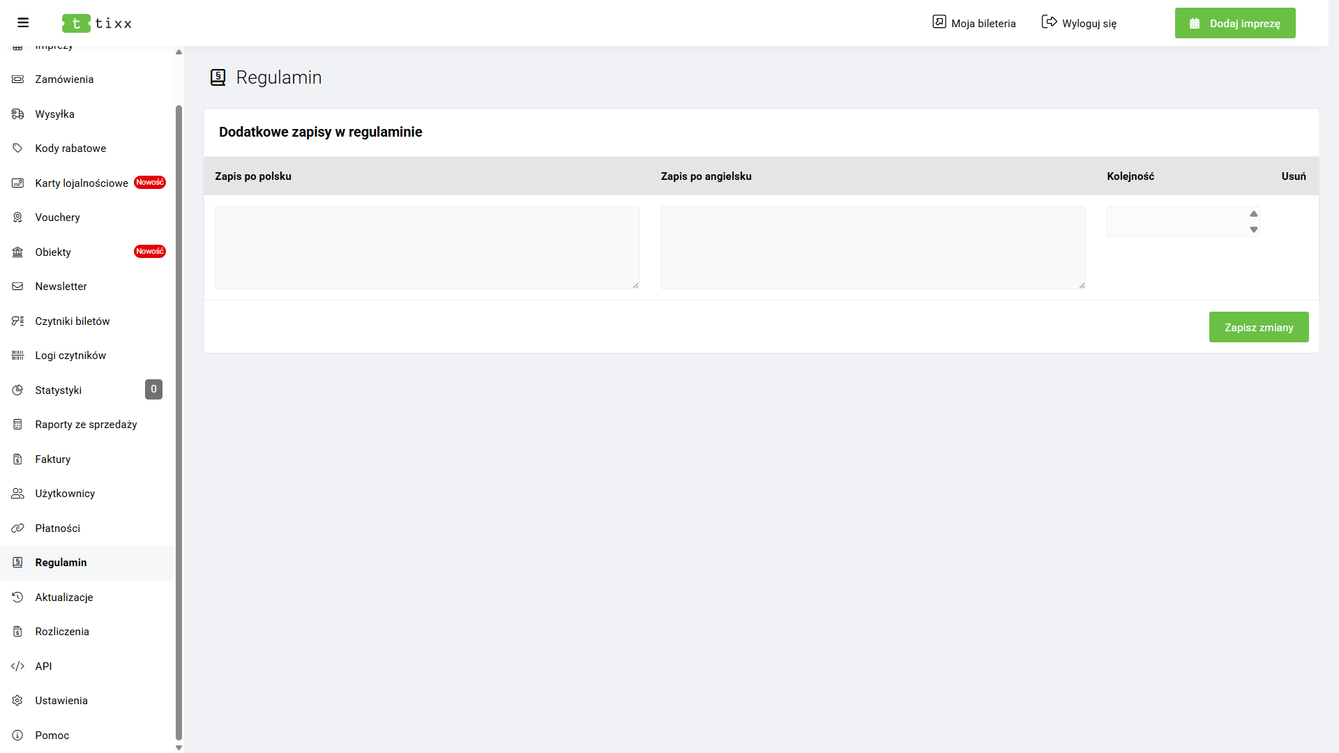 Domyślne zapisy regulaminu są dostarczane przez nas — zostały przygotowane w celu standaryzacji procesu płatności i zapewnienia zgodności z zasadami prawidłowo prowadzonej sprzedaży biletów online. Są one niezbędne i potwierdzają rzetelność całego procesu.
