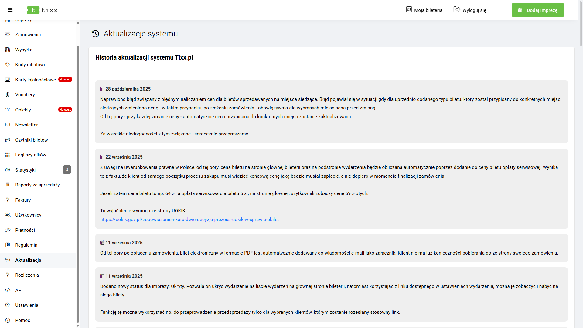 Źródło informacji o aktualizacjach systemowych wprowadzonych przez dystrybutora systemu sprzedaży biletów.