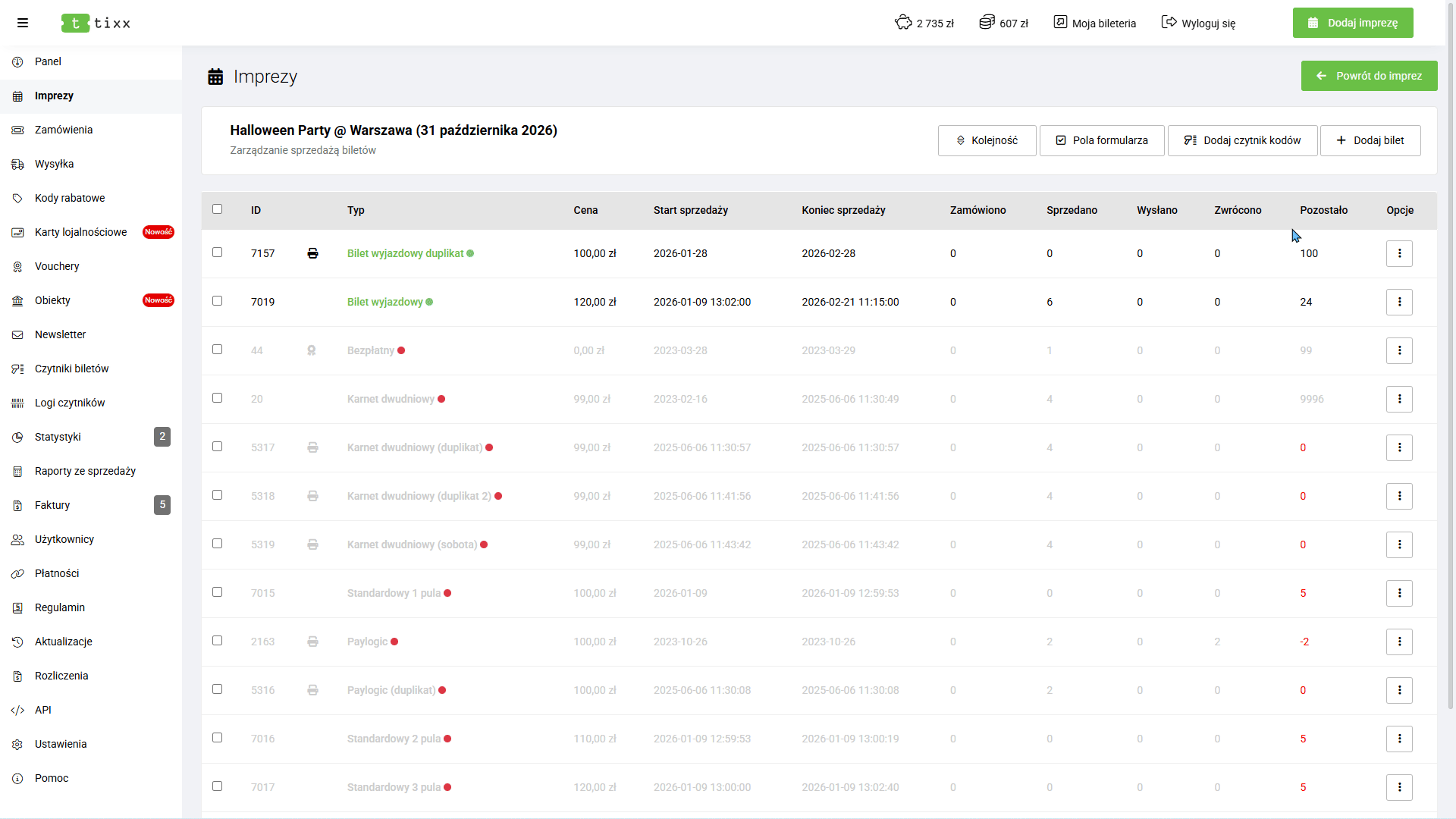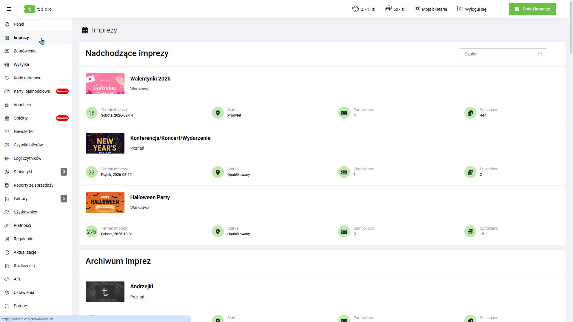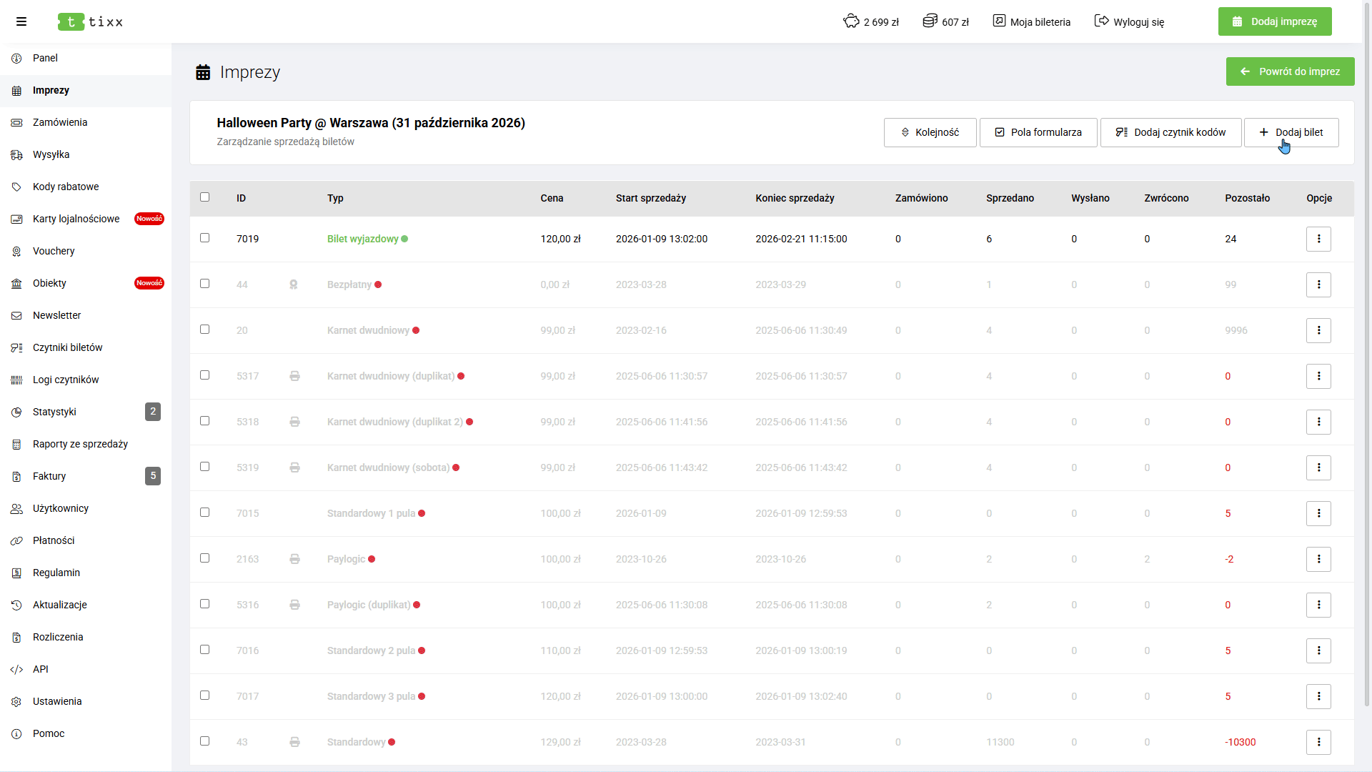 Kolejnym krokiem w tworzeniu kompletnego wydarzenia jest dodanie do niego biletów. Aby to zrobić: przejdź do sekcji „Imprezy”, najedź kursorem na wybrane wydarzenie (lub kliknij trzy kropeczki) i wybierz opcję „Bilety”.